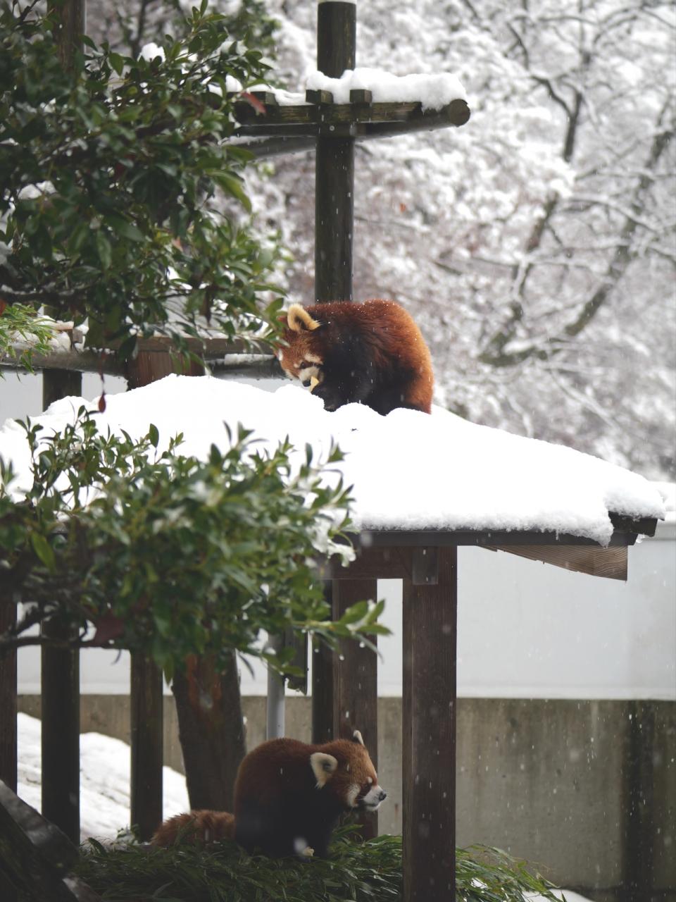ペアリング中は両サイドの放飼場は使ってません。雪の日はもったいないな。特に左側は、赤い実がなる木があるので、雪とのコントラストがとても綺麗なんですよね。まぁ、レッサーパンダが登らないと意味はないのだけれど(笑)