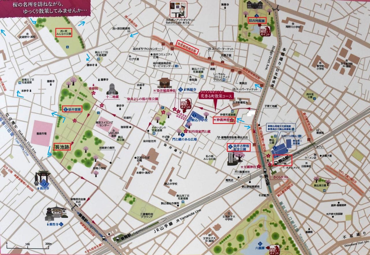 駒込駅→妙義神社→染井銀座商店街(しもふり銀座、染井銀座)→染井霊園(長池跡)→本妙寺→都電西ヶ原4丁目→西ヶ原みんなの公園→(西ヶ原商栄会ふれあい通り→一里塚→西ヶ原駅→平塚神社)→(旧古河庭園) -