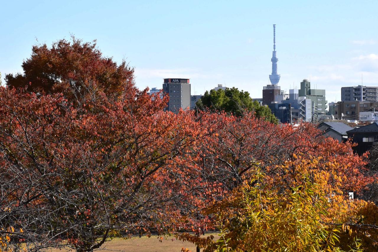 「紅葉した桜とスカイツリー」(西ヶ原みんなの公園)