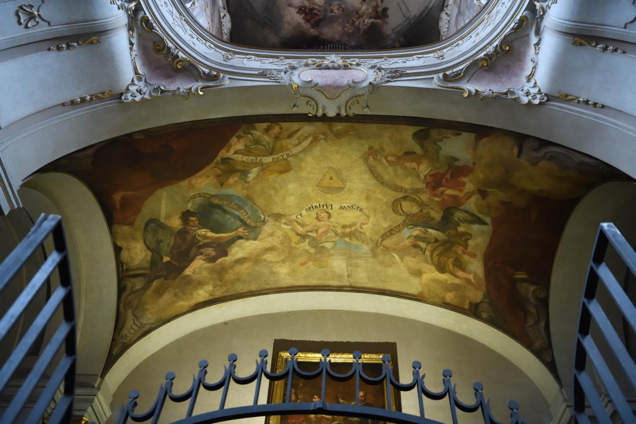 この天井画は、雲に座る神とキリスト、そしてその上に聖霊を象徴する鳩が描かれ、三位一体を表しています。