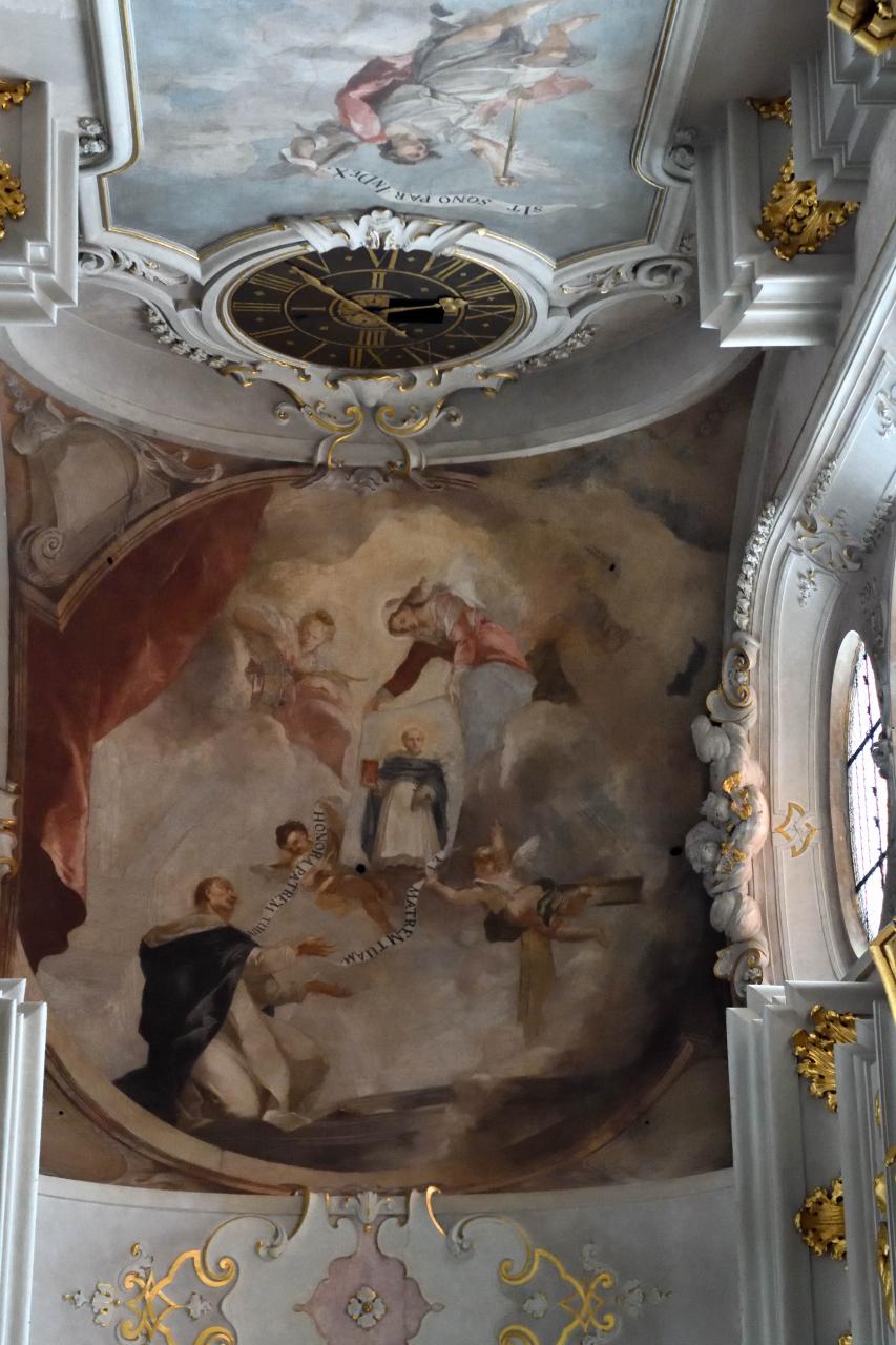 この天井画は、雲に包まれた聖母と聖職者たちが描かれ、神聖な対話の場面を表しています。