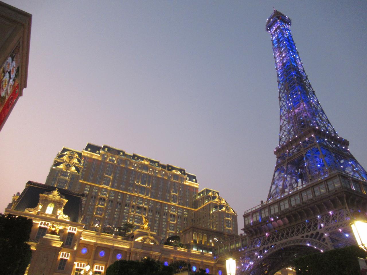 パリジャンマカオのシンボルのミニ・エッフェル塔。パリジャン、ロンドナー、ベネチアン、フォーシーズンズなどホテルは繋がってますが、外に出ないと方向感覚がつかめないです