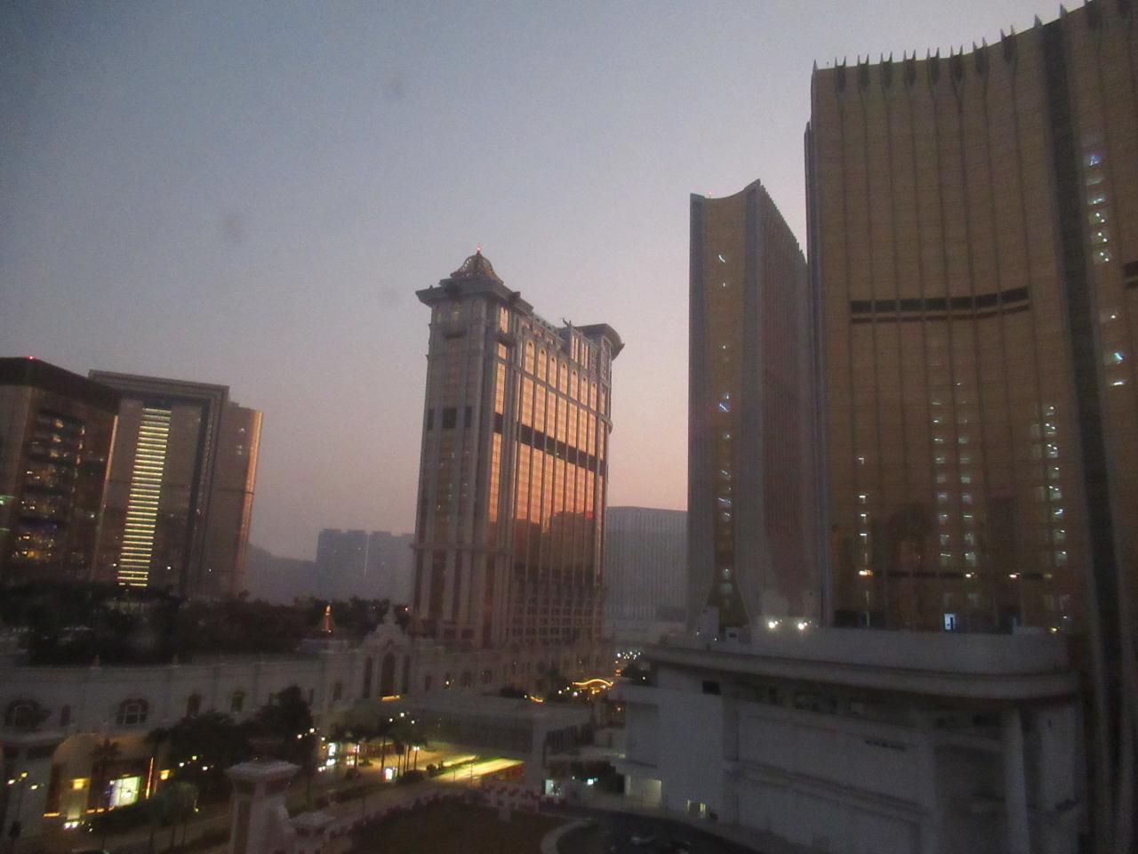 旅行3日目の12月30日の午前3時、宿泊しているブロードウェイ マカオ ホテルの部屋の窓から。夜明け前のギャラクシー・マカオはライトアップも消えていて暗かったです