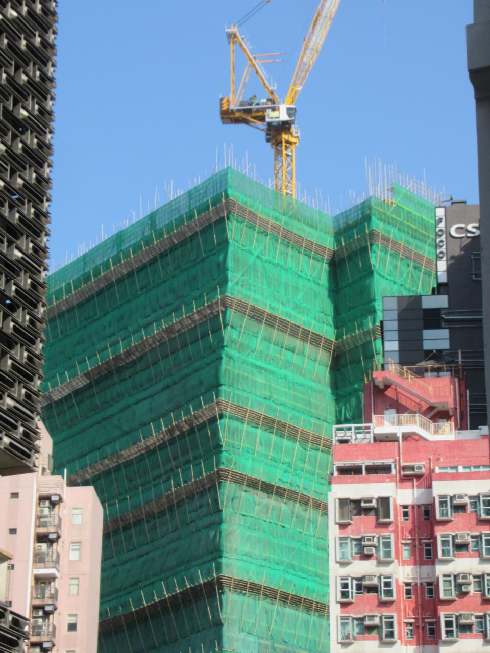 大館の外のビルでは竹でで組んだ足場で工事中。近代ビルに竹のミスマッチ