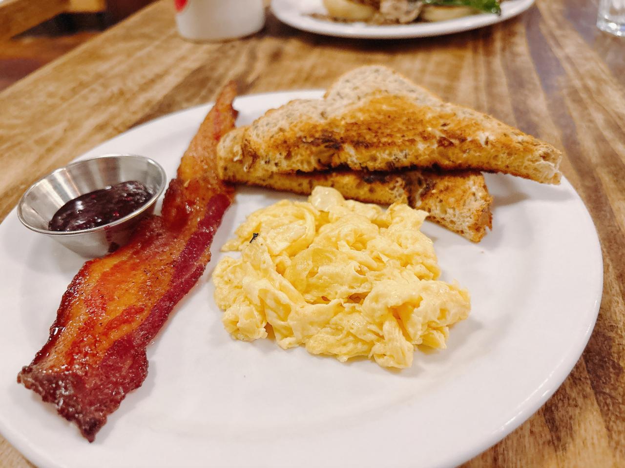 トースト、ベーコン、スクランブルエッグ -