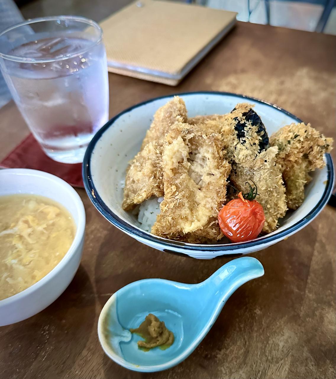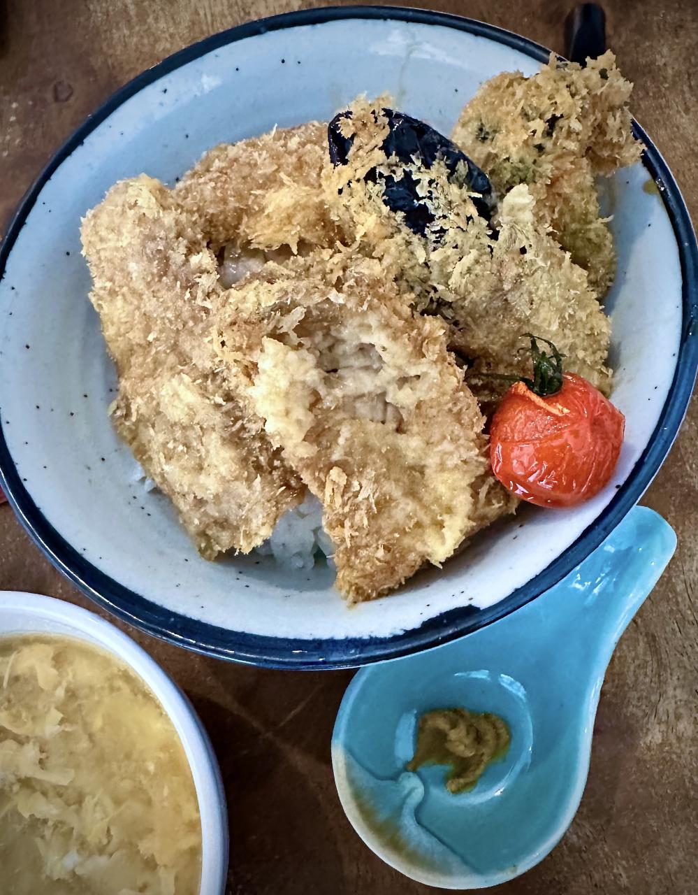 「野菜合盛りたれかつ丼(味噌汁付き)」290B(=1500円)とやらを注文してみた。沖縄料理 金城 和食