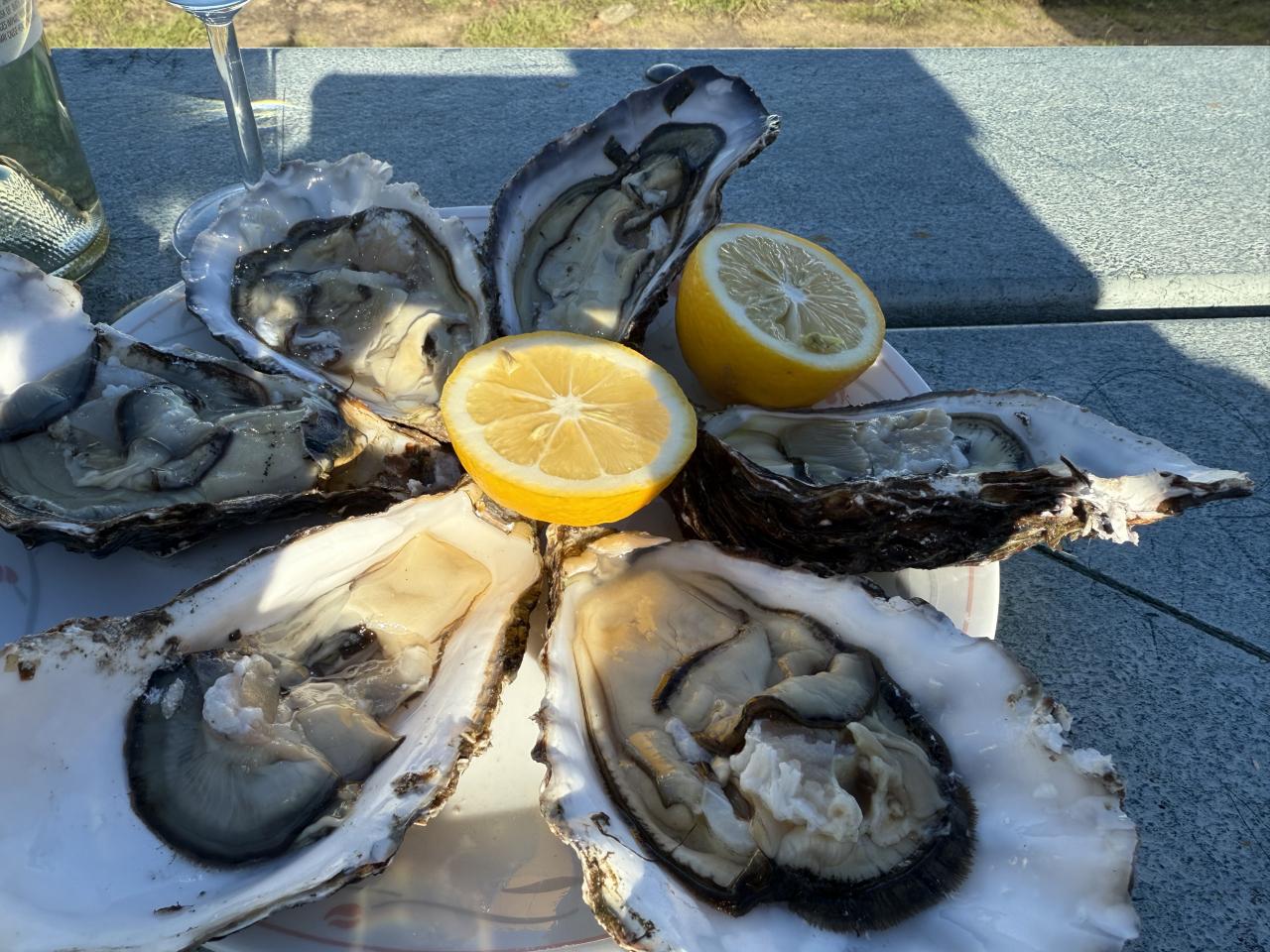 海外の牡蠣って小さいのが主流じゃないですか。いつもどうしてもっと時間をかけて成長させないんだろうっと思っていたんですが、味比べしてみて納得です。小さい方が濃厚、クリーミー。自然の中でいただく生牡蠣は格別でした。