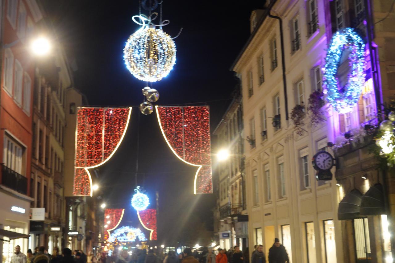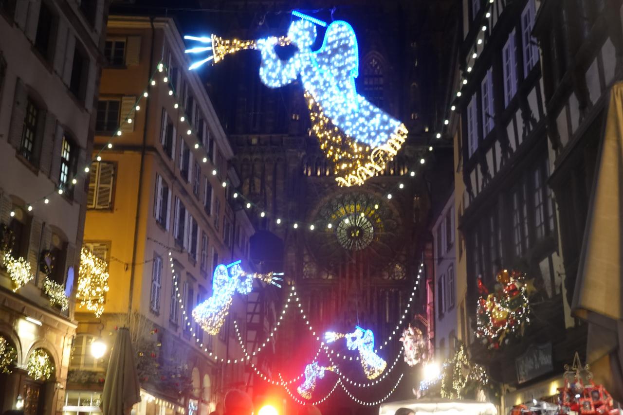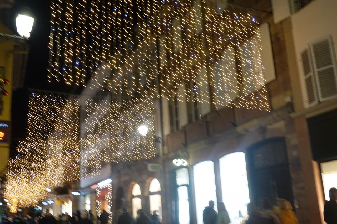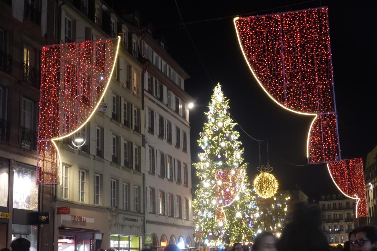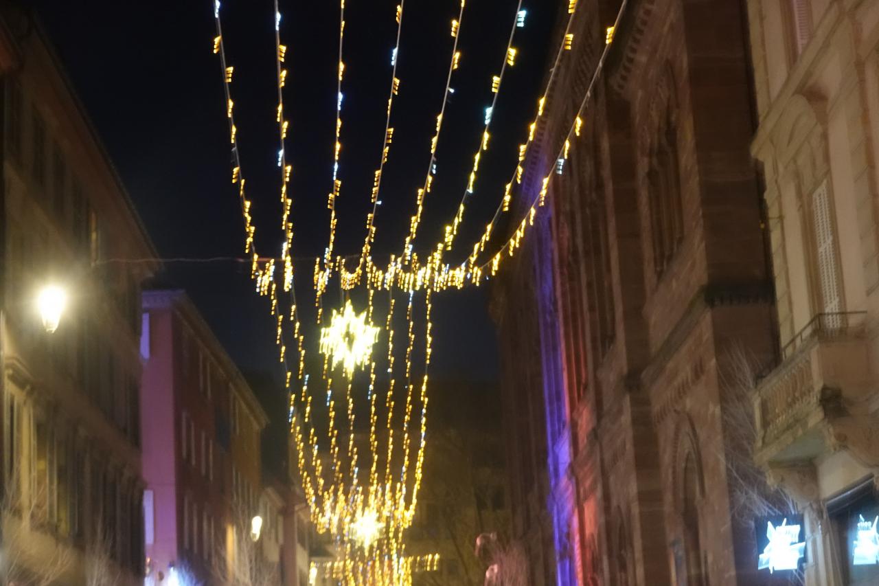 クレベール広場のクリスマスマーケットや大聖堂付近のイルミネーションを楽しみ、トラムE線Republiqueの駅まで歩いて向かいます。