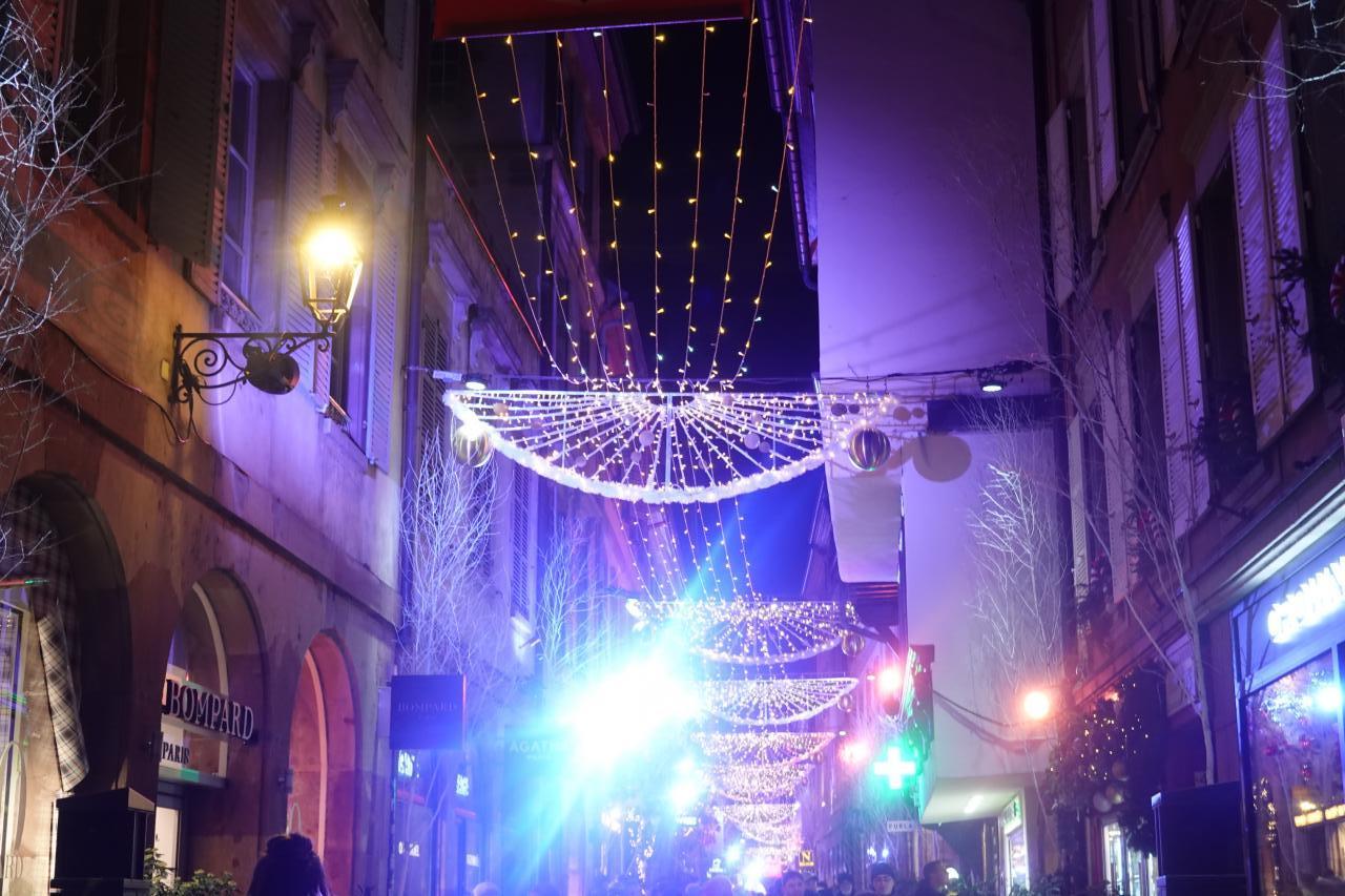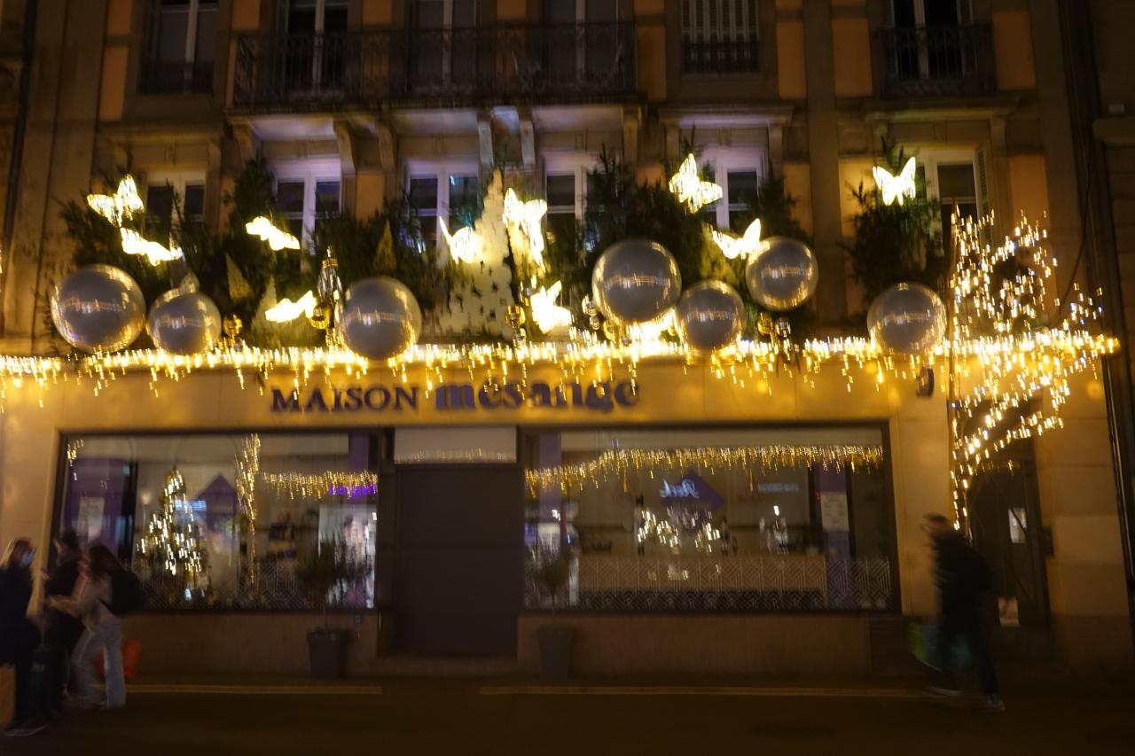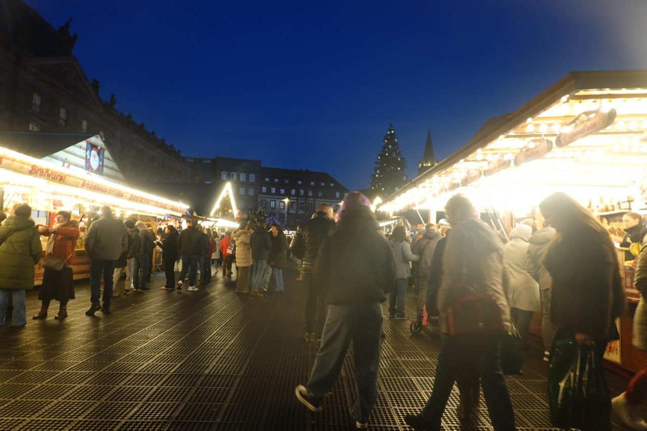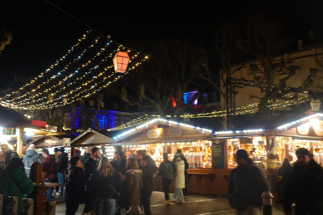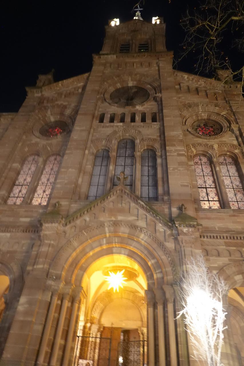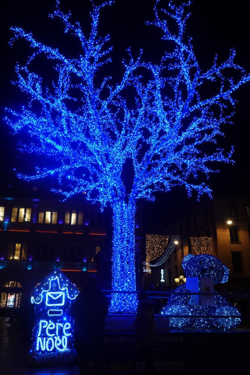クレベール広場のクリスマスマーケットや大聖堂付近のイルミネーションを楽しみ、トラムE線Republiqueの駅まで歩いて向かいます。