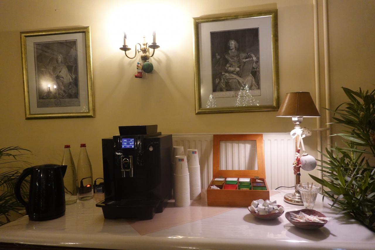 部屋にはお茶セットは付いていませんが、公共のスペースに用意されていれ、ドリンク類は有料でコーヒー、紅茶は無料です。有料のものを飲む場合はリストに書き込むようです。 -