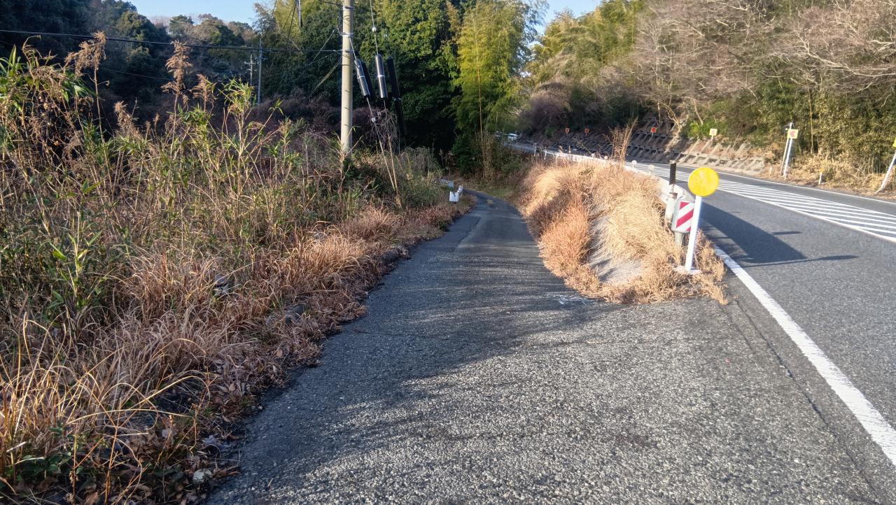 国道の歩道に出て1分ほど進んだ場所に おそらく旧道の出口になるところを見つけました。擁壁が始まる地点です。今思うと ダウンをぼろぼろにすることなく直進で国道に出ることができたかもしれなのかなと思います。