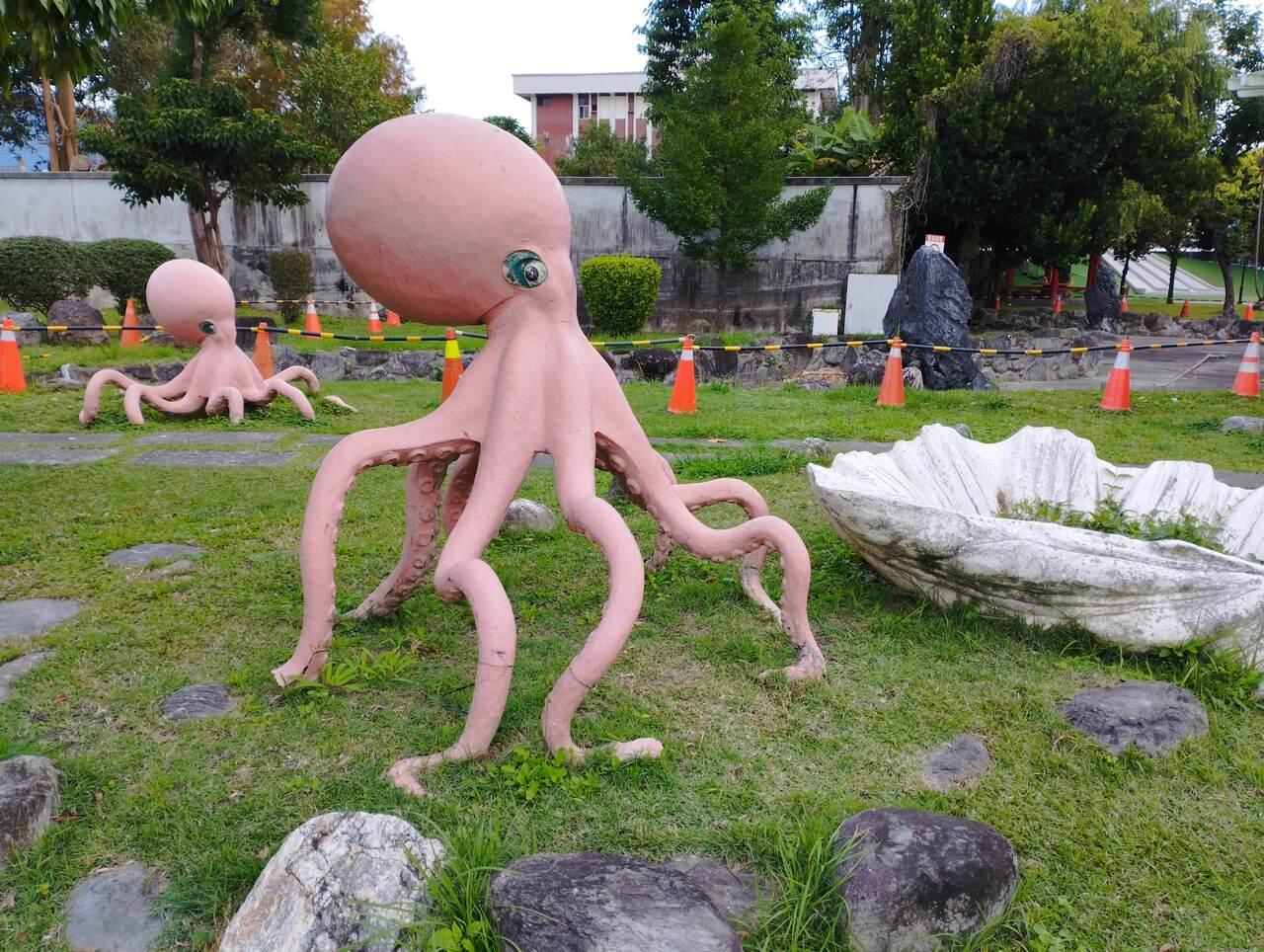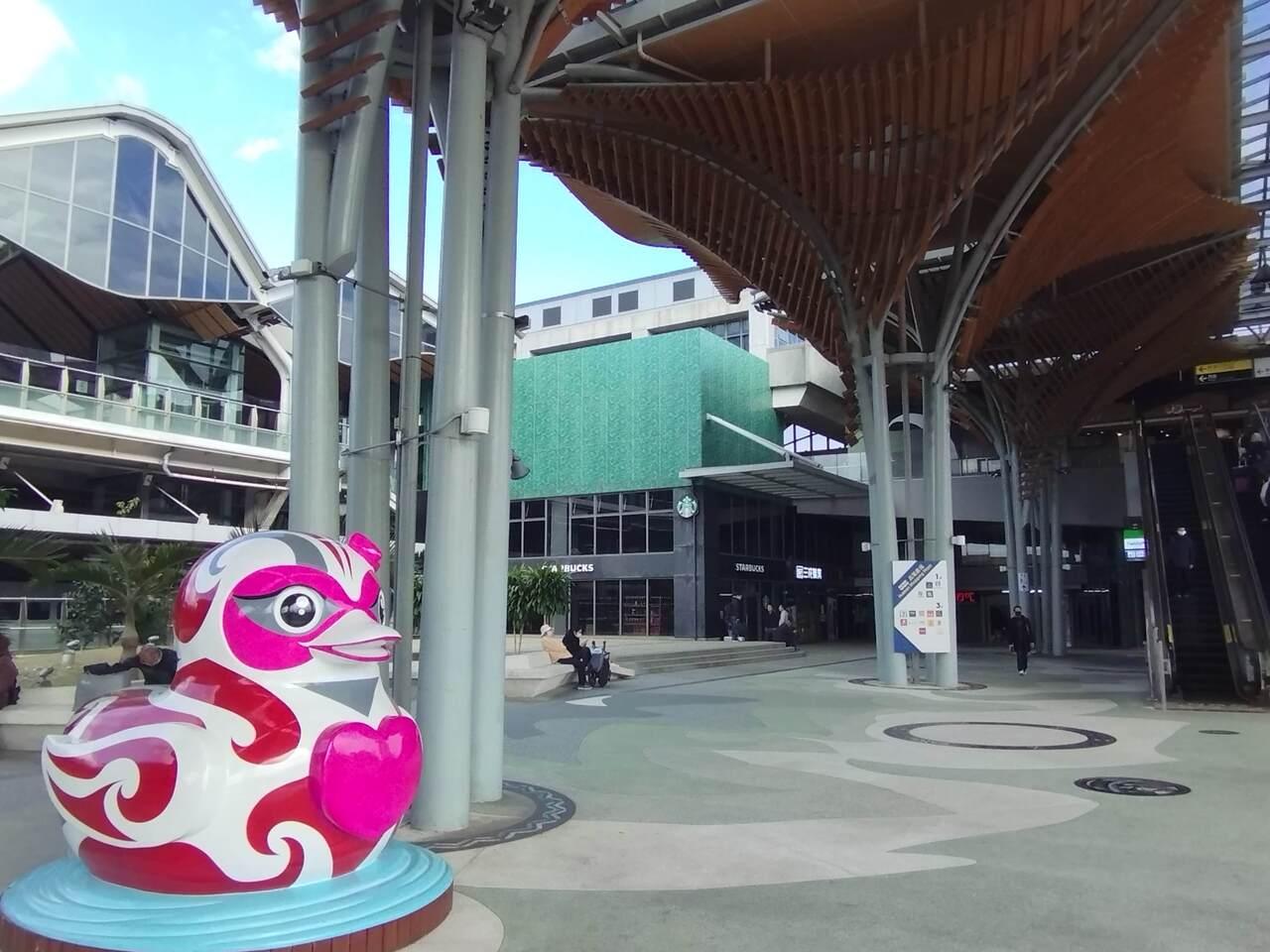 花蓮駅に到着。左端にいるのは花蓮紅面鴨という観光キャラクターだそう。