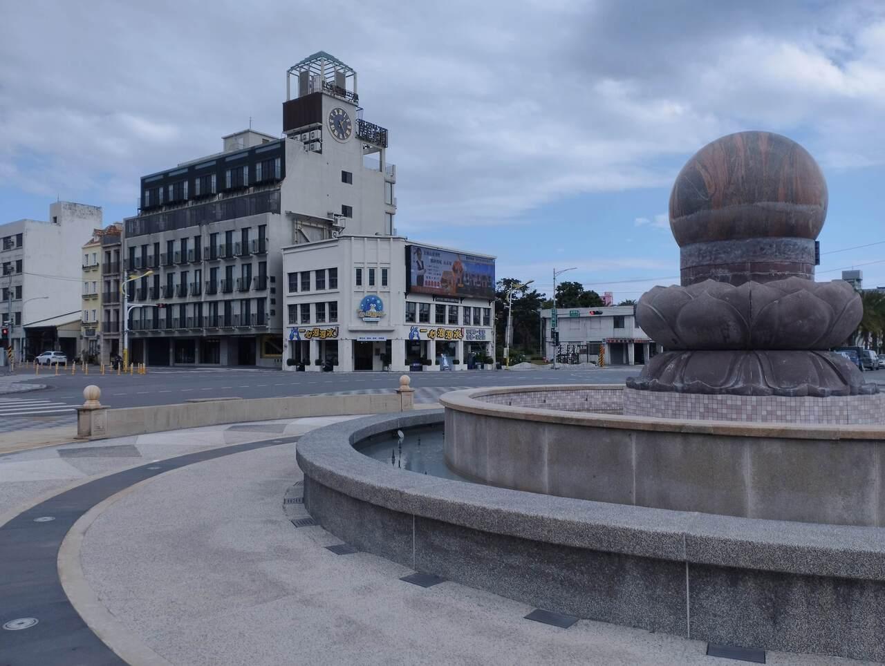 花蓮市の中心にある噴水とホテル"麗翔酒店"。