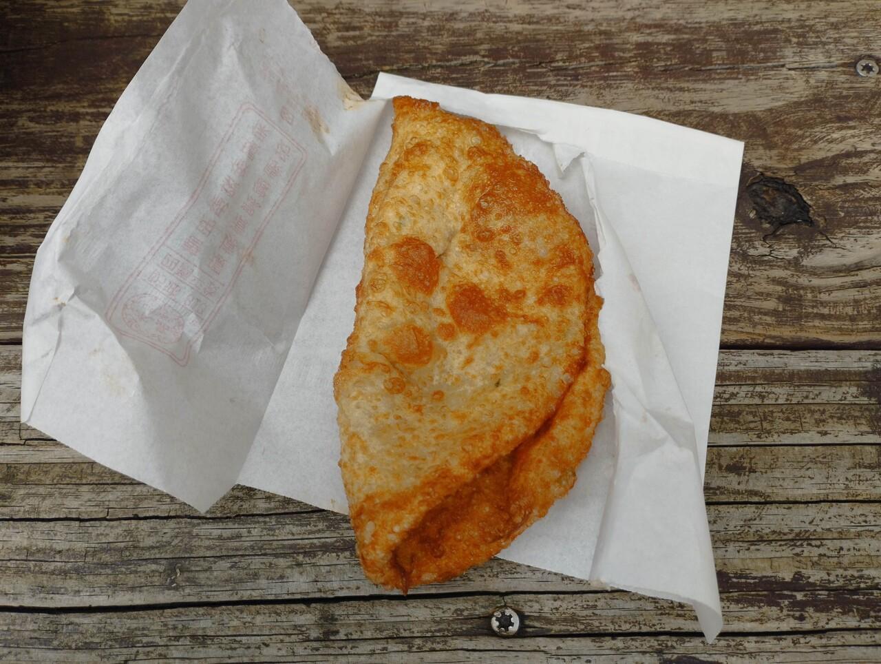 ホステルまでの帰り道で先ほどの葱油餅屋に戻ってきた。老舗が2軒並んでいるので客が多いほうで卵無しのベーシック版を選ぶ。