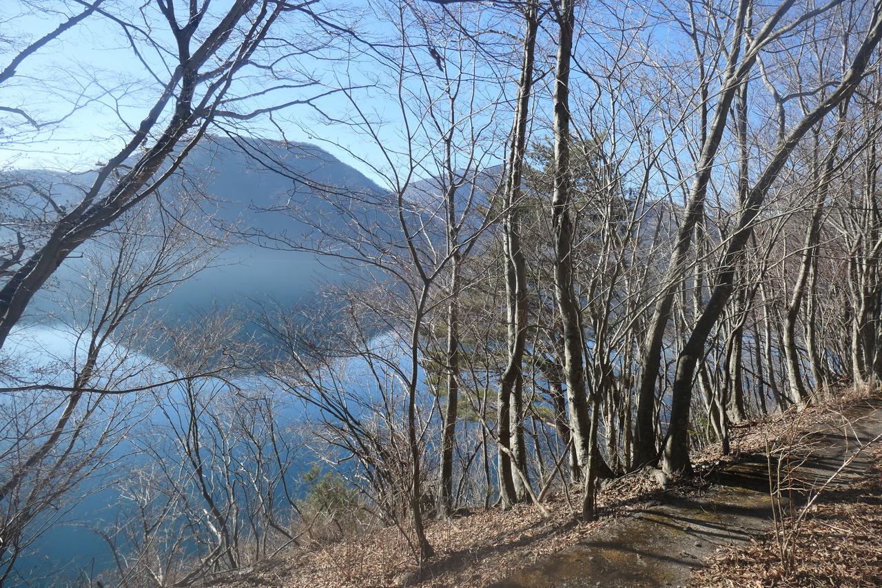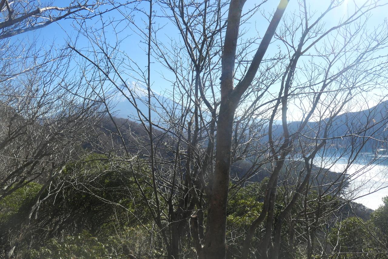 パノラマ台とは打って変わって、ヤマップと付き合わせて確認しないと見過ごしてしまいそうな、ルートから外れた小さな展望台(と言うかスペース)から精進湖を見下ろしました。