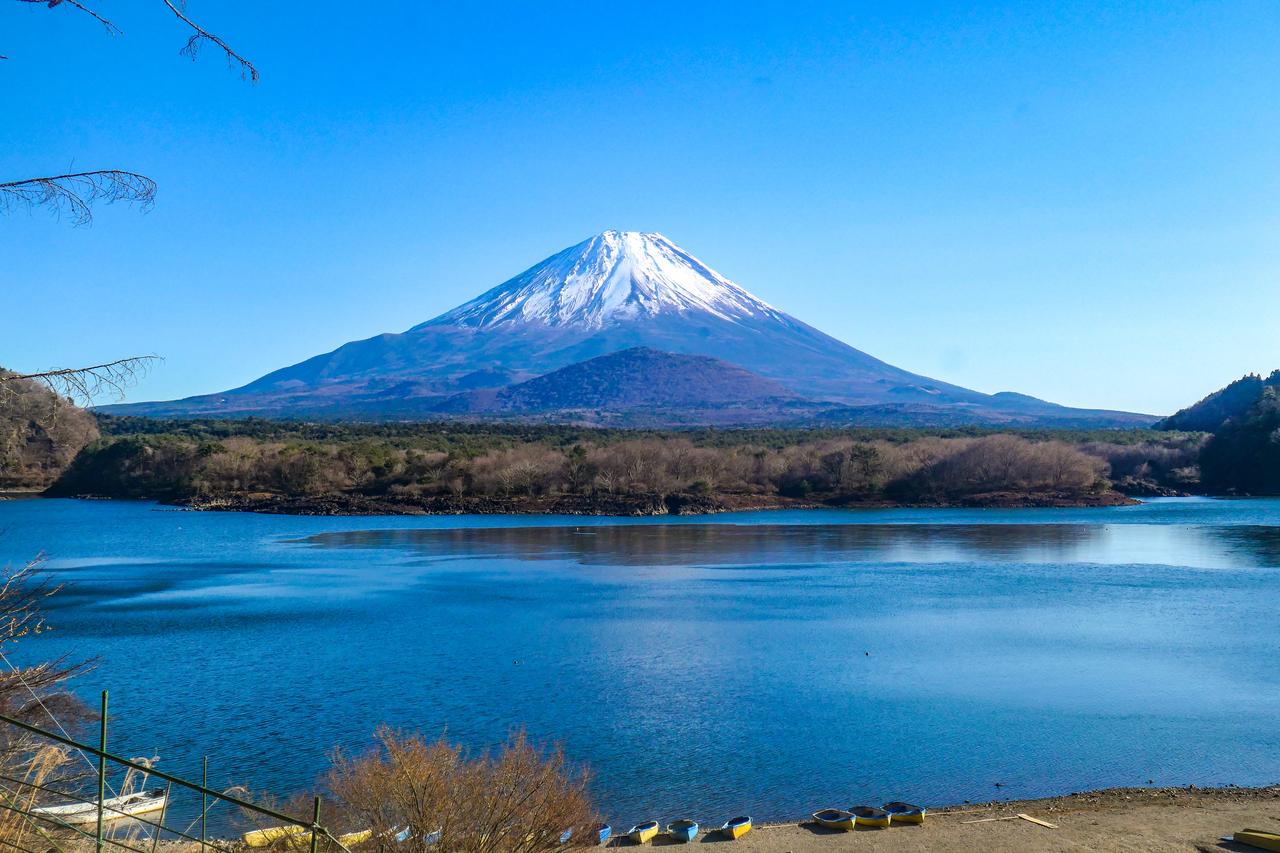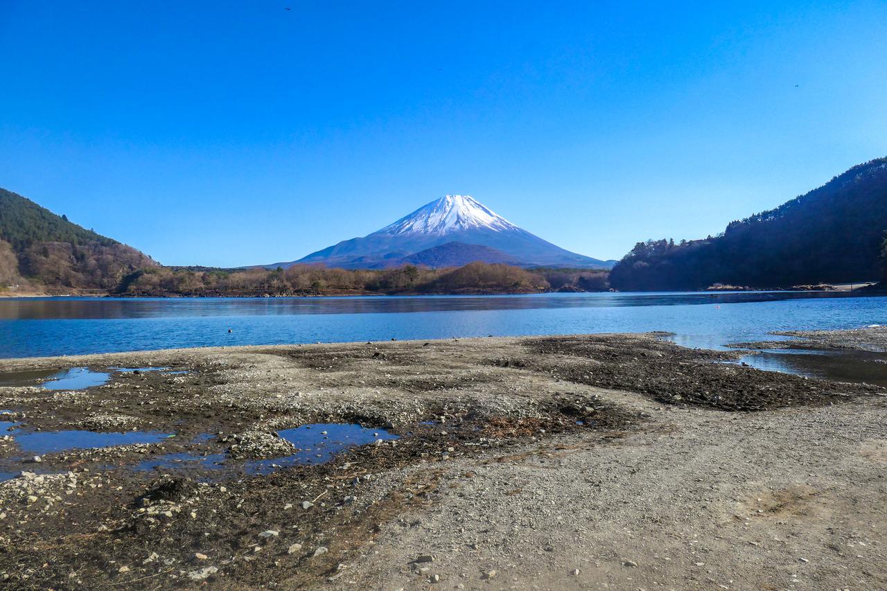 精進湖他手合浜から見る富士山は、手前中央に大室山が聳え、その姿から「子抱き富士」と呼ばれるので一目瞭然です。