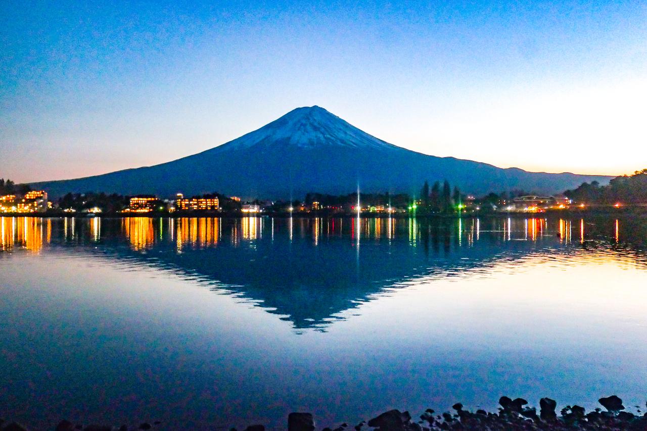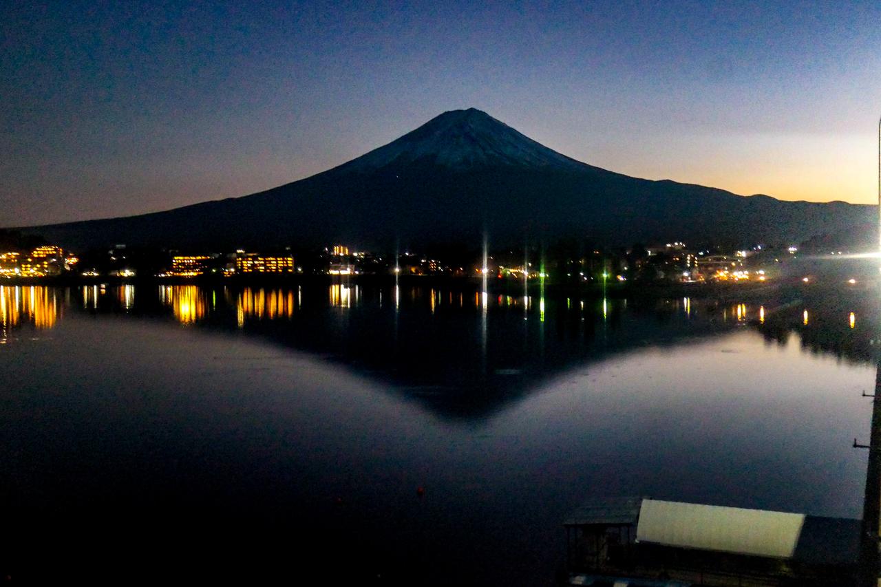 夜も暮れ始め、シルエットのみの逆さ富士。