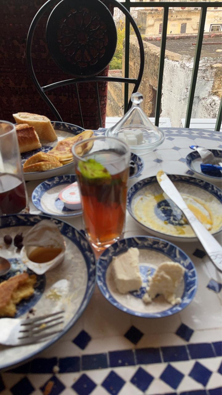 ウェルカムミントティとお茶菓子を屋上でいただく。ホテルスタッフのハムザと旅行の計画を立てる。シェフシャウエン日帰りバスツアーの料金を聞くとアプリの方がお得に感じた為、彼には今夜のハマムの手配のみお願いして、それまで旧市街散歩兼夕飯に行く事に。宿に辿りつけるか心配だったので迷った時の連絡先としてハムザのWhatsApp のIDを登録させてもらいました。