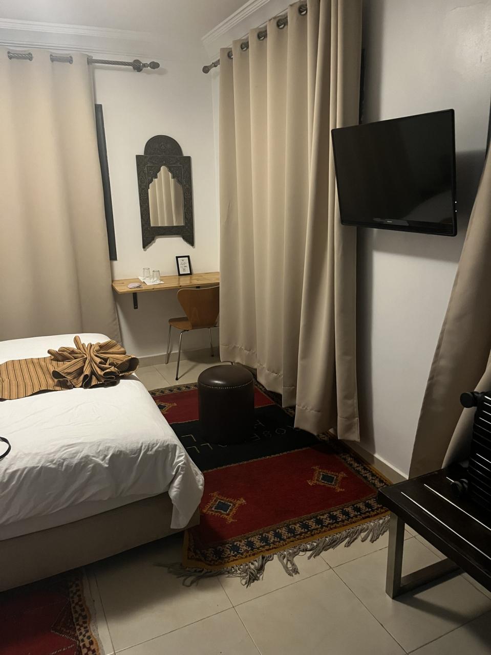 Riad Qobbat zaouïa。私の部屋は1階玄関すぐ、台所の向かい。この画像は暗いが枕元の鏡の上に灯りが有ります。枕元にコンセントもあり、エアコン、毛布、ヘアドライヤーあります。