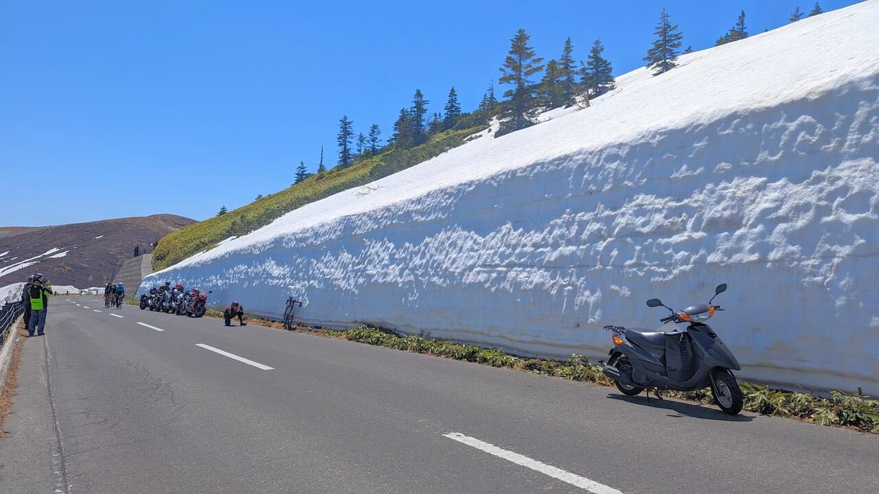 標高が高くなるにつれて路端に雪が残っている箇所が増え、雪の大壁になっているところも!身長を遥かに上回る高さだったので、3.5~4mくらいはあったと思います…! -
