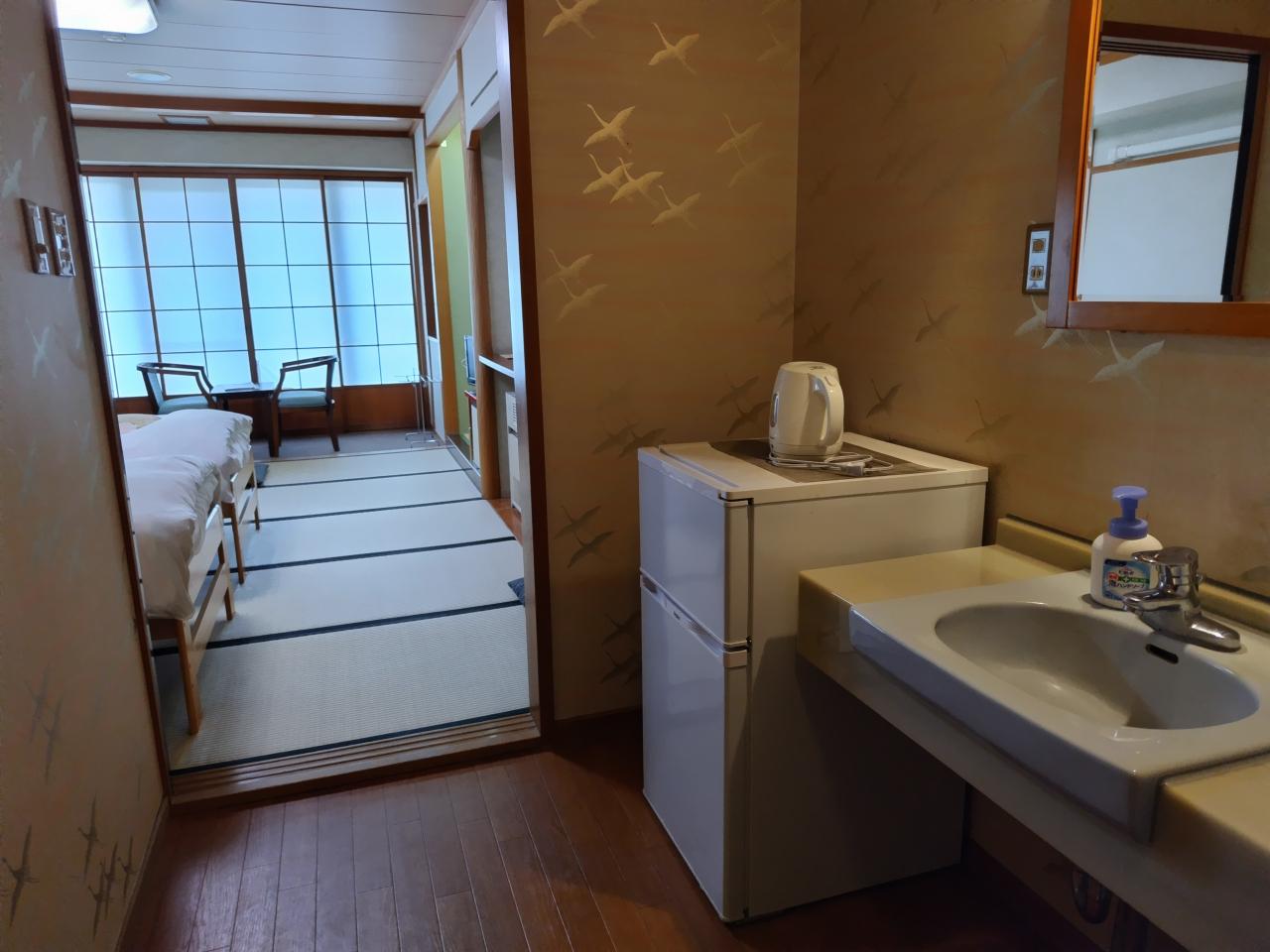 入るとすぐに洗面所、空の冷蔵庫、湯沸かしポットがあります。