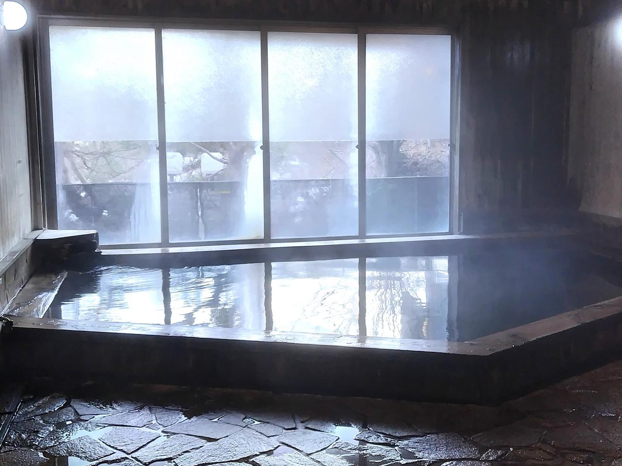 掛け流しの源泉は熱めのお湯で、外気は零度に近いので、ずっと肩まで浸かったままです。