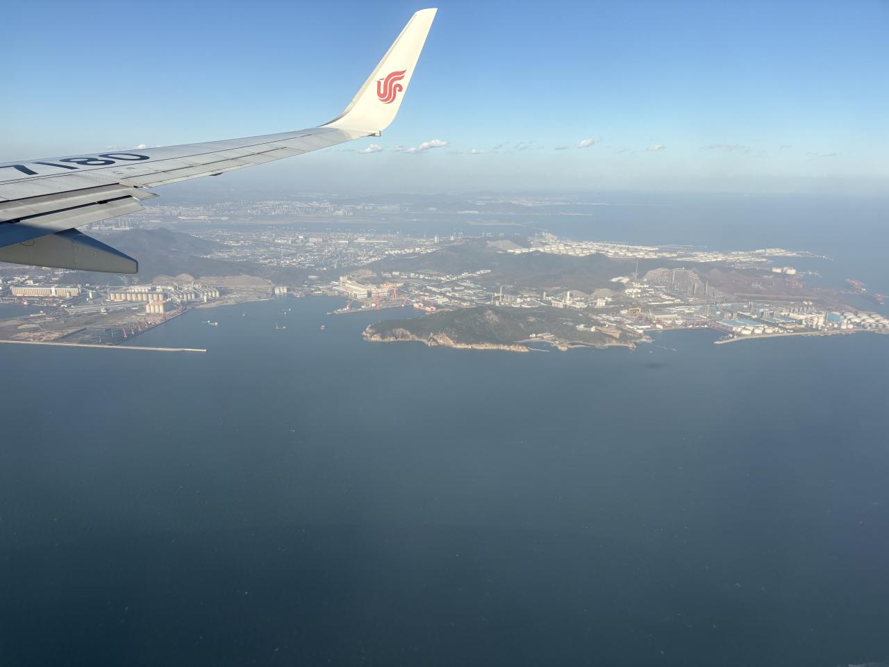 大連市です。半島の先に旅順港があるはずですが、こちら側の座席からは見ることができませんでした。