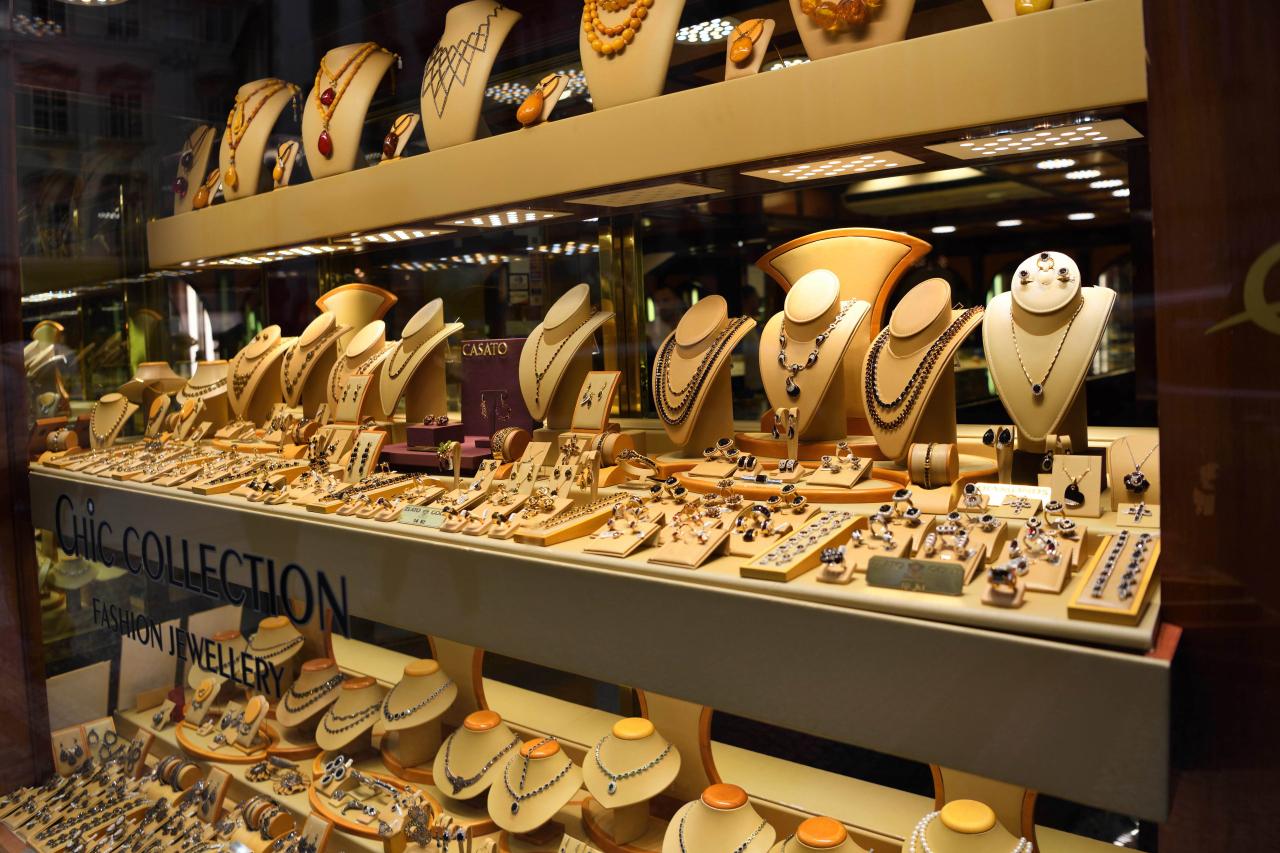 ショーウィンドウには、ネックレスやイヤリングなどのアクセサリーがずらりと並び、見た目も華やかです。デザインも色もさまざまで、通りがかりにちょっと覗くだけでも楽しい雰囲気でした。