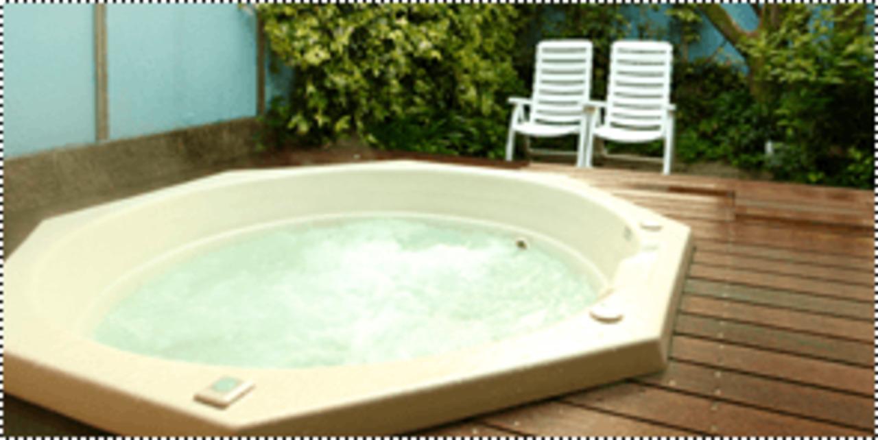 1階は15畳の和室。 奥にはテラスと檜の露天風呂。 洗い場は外なので、今の季節寒いかも。