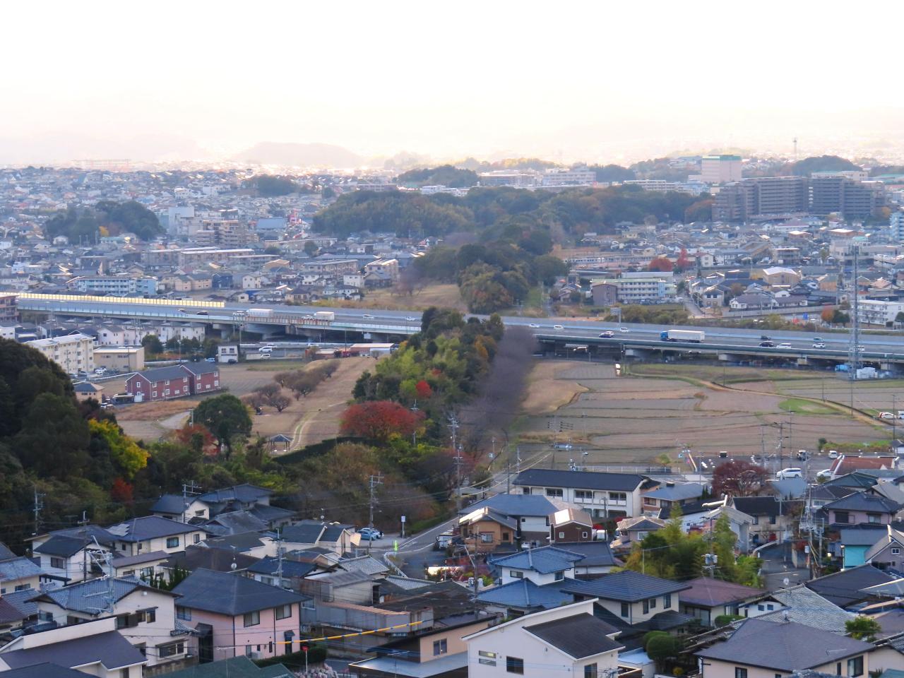 北東土塁の南端には、九州自動車道が走っています。その奥には、先に写真を撮った西鉄の線路があります。