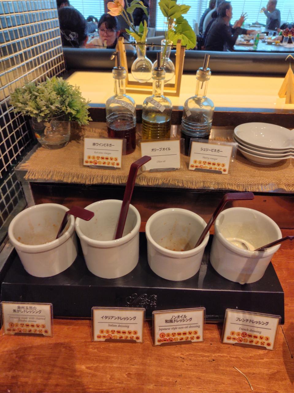 下段は泉州玉ねぎの焦がしドレッシング、イタリアンドレッシング、ノンオイル和風ドレッシング、フレンチドレッシング -