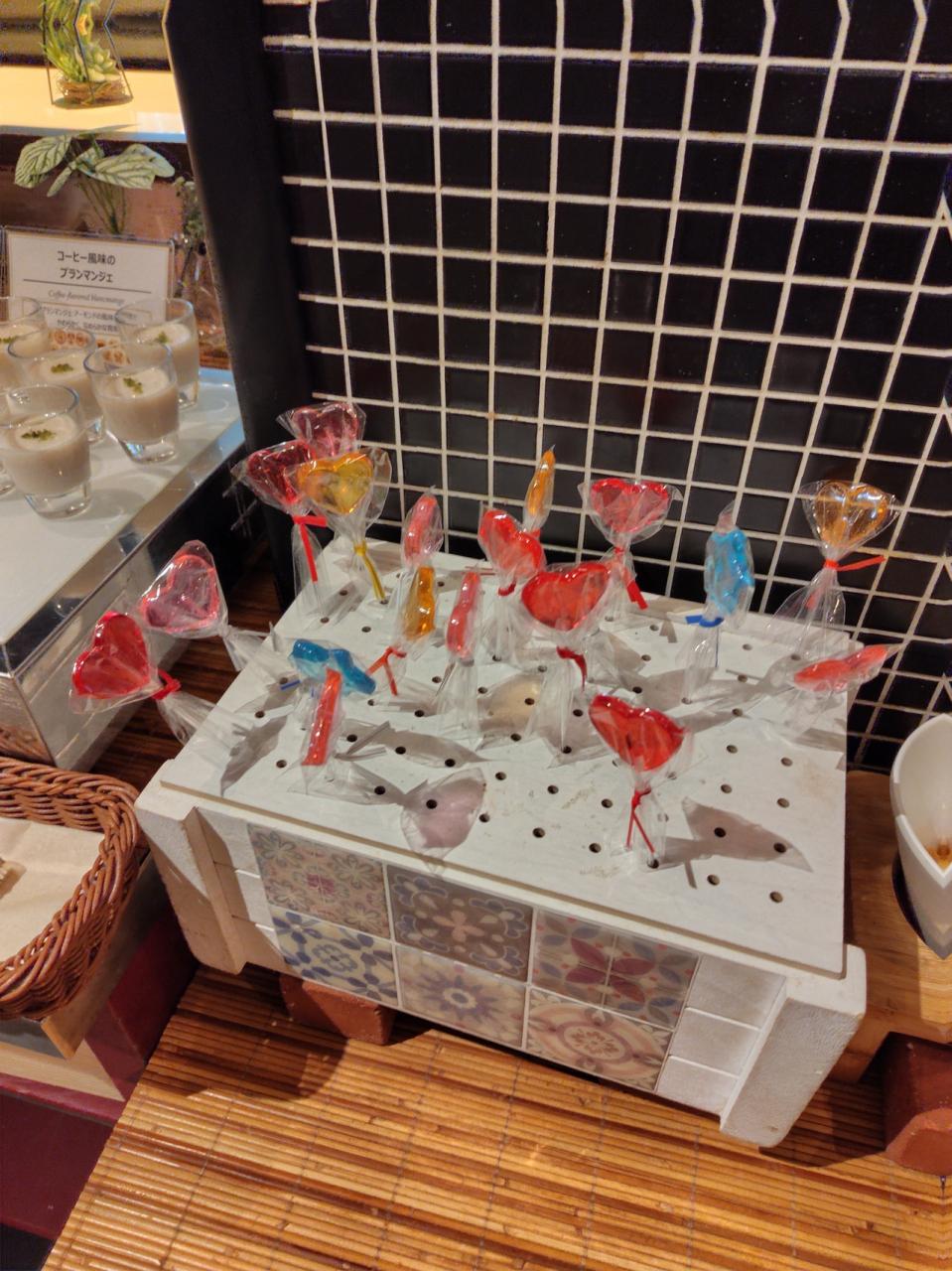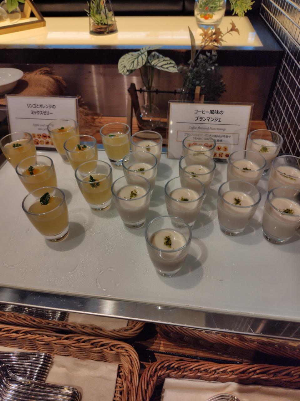 デザートコーナーのリンゴとオレンジのミックスゼリー、コーヒー風味のブランマンジェ