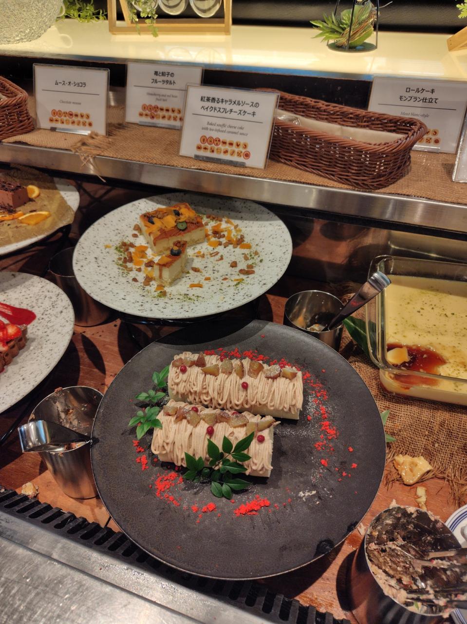 ロールケーキモンブラン仕立て、紅茶かおるキャラメルソースのベイクドスフレチーズケーキ