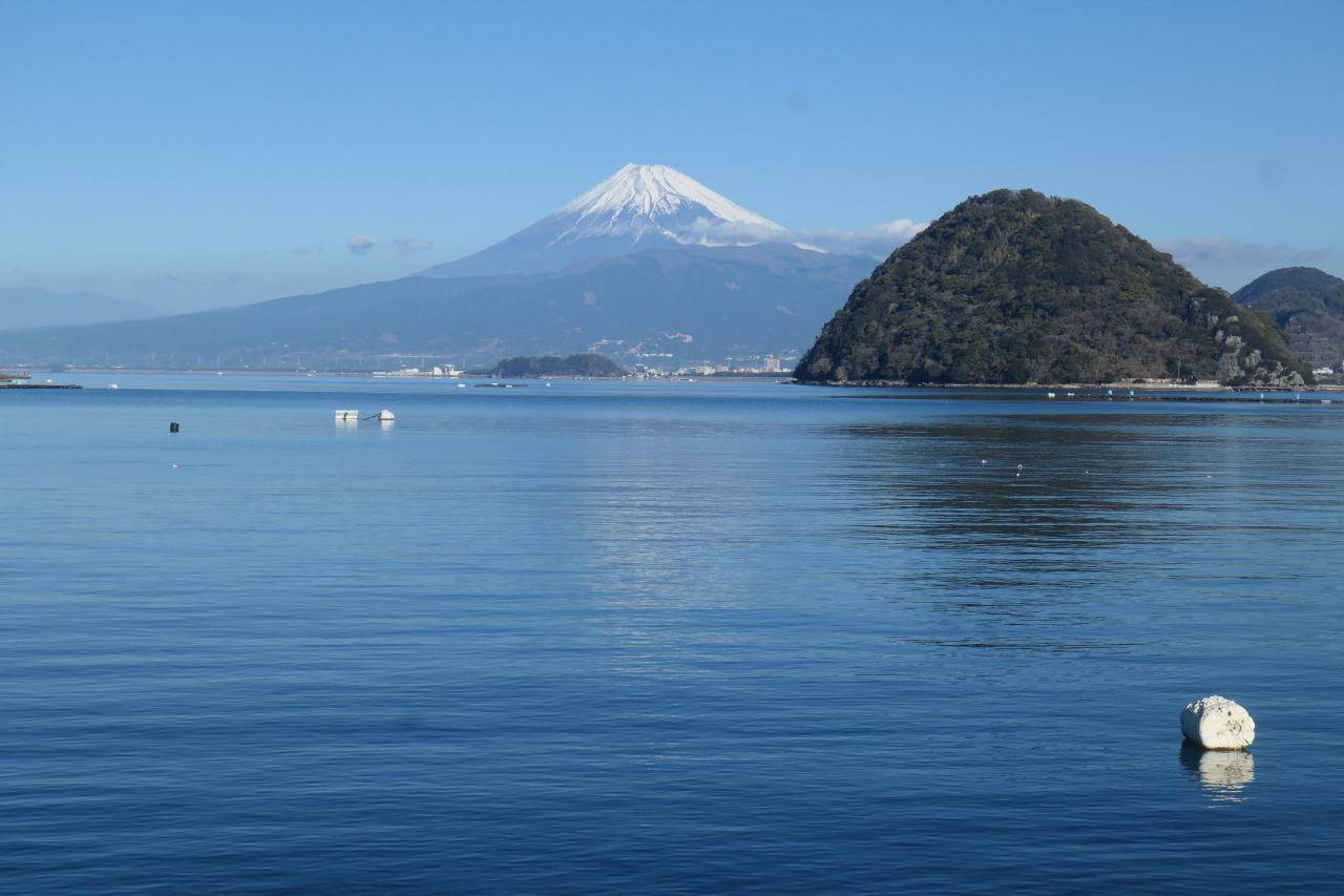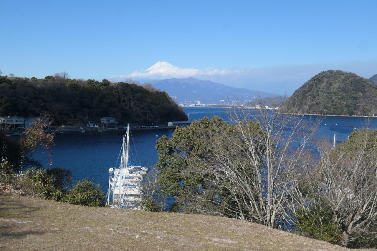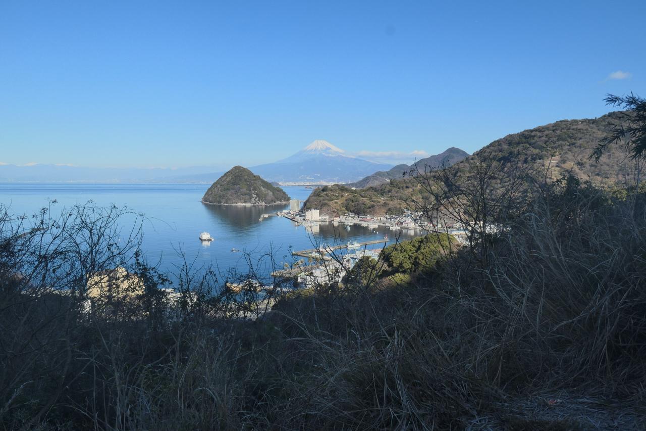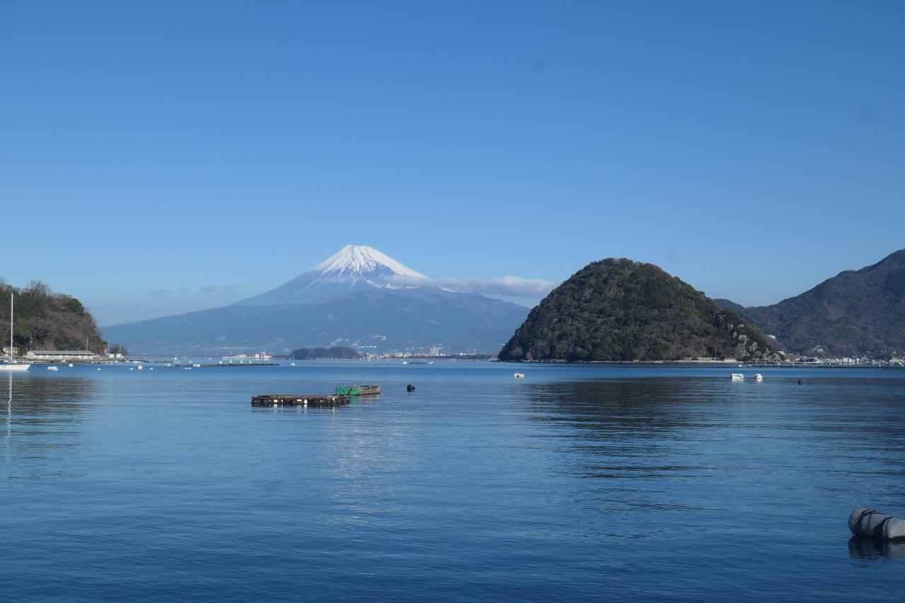 もうちょっと進んだ先に見晴らしの効くスポットがあります。複雑に入り組んだ湾に浮かぶ淡島。そしてその奥に富士山ドーン!まるで絵に描いた様な箱庭感がたまりません。発端丈山の展望台からも美しいのですが、湾の最深部から、富士山を正対する様な構図なので、安定感を感じるところが、内浦重須の良いと感じるところです。