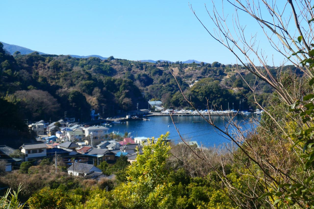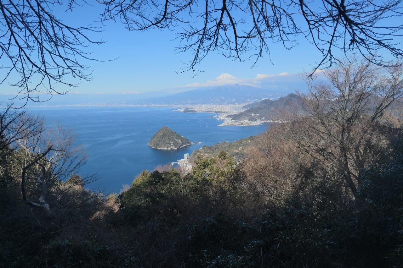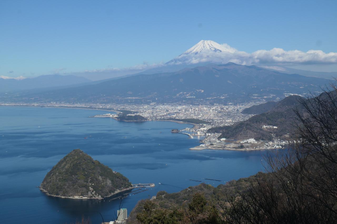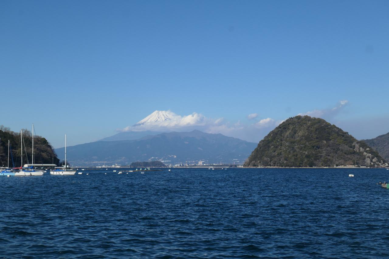 もうちょっと進んだ先に見晴らしの効くスポットがあります。複雑に入り組んだ湾に浮かぶ淡島。そしてその奥に富士山ドーン!まるで絵に描いた様な箱庭感がたまりません。発端丈山の展望台からも美しいのですが、湾の最深部から、富士山を正対する様な構図なので、安定感を感じるところが、内浦重須の良いと感じるところです。