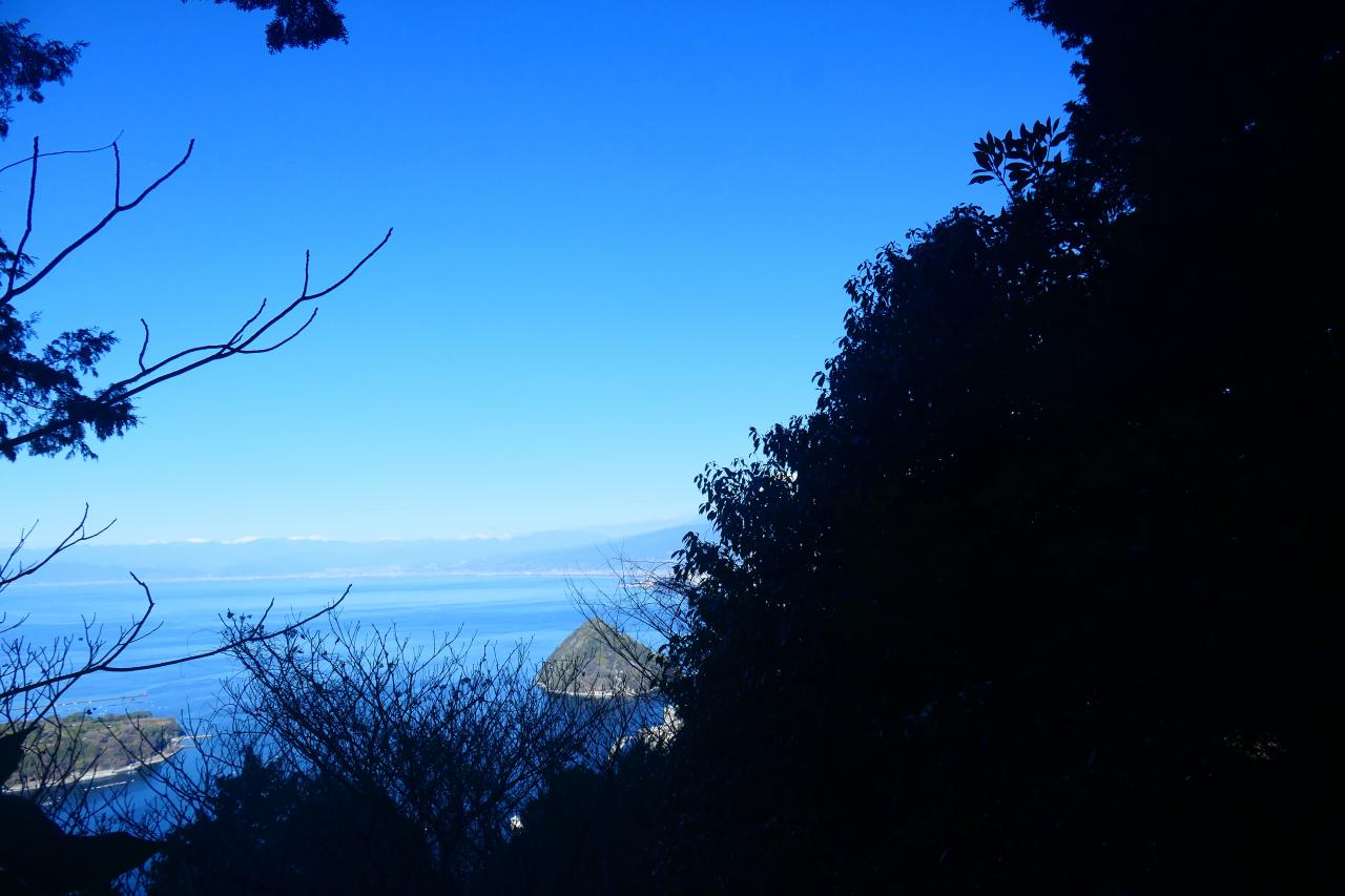 途中淡島がチラリズム。登山道は頂上付近は傾斜が強くなるものの、そうした場所にはロープが張られ(ロープ場では無く、あくまで補助として)安全性が保たれています。