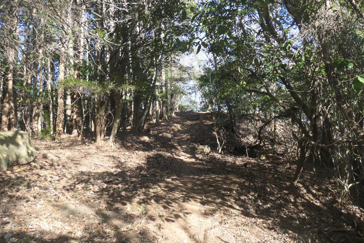 引き返す時に再び堀切を渡ります。往時はもっと深く掘られており、歩いて迫る敵の行く手を阻んだ事でしょうが、今となっては登山家でさえ軽々と超えていきます。