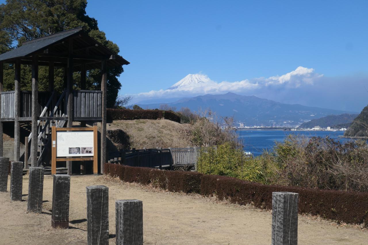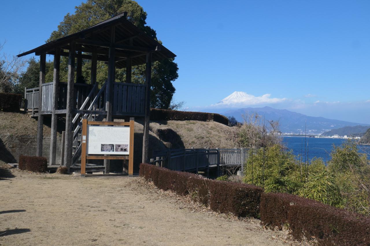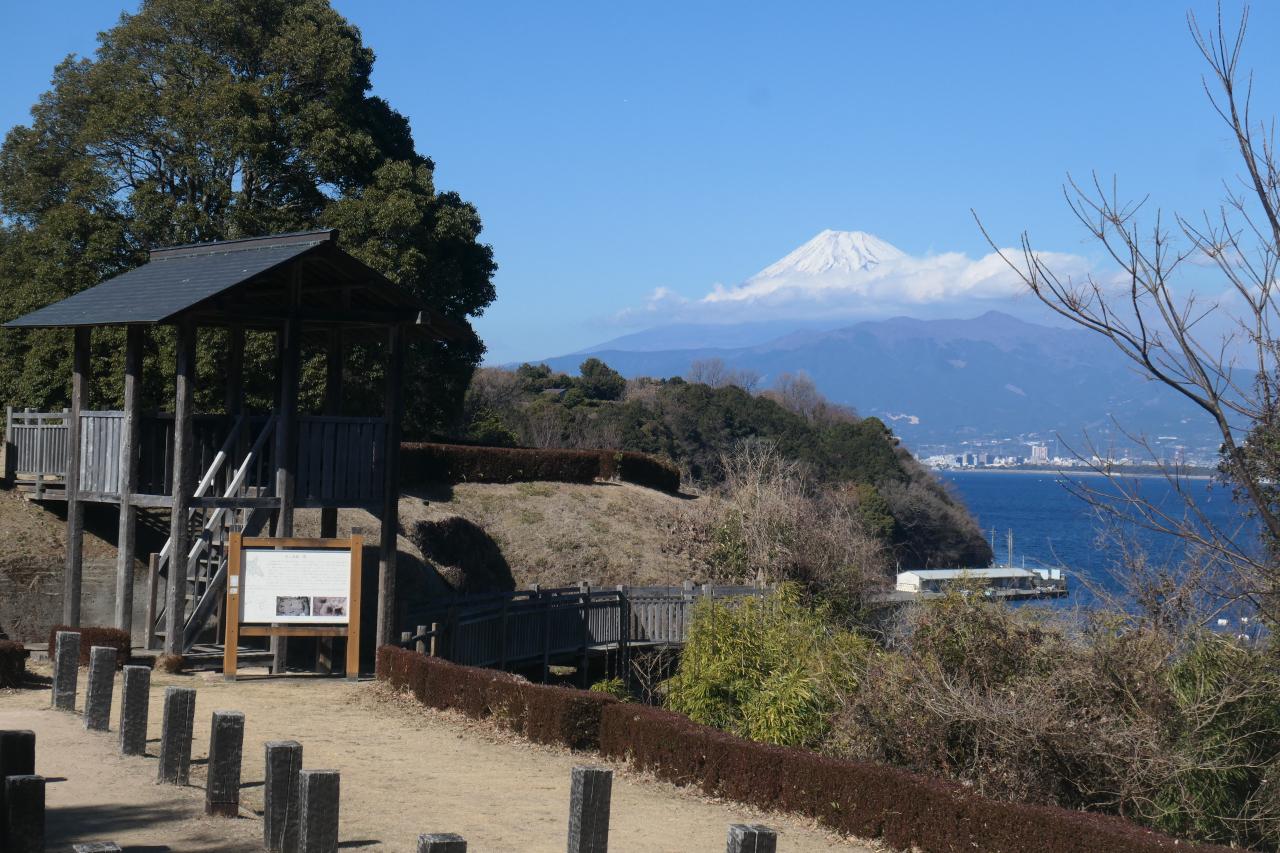 そしてこの光景です。天守閣を持たない、即ち余り観光客が訪れない城跡は、どうしても絵的に地味になってしまう場合が殆どですが、富士山が背景にあるだけで断然見違えます。重厚な歴史を持つ城跡、美しい駿河湾、そして背景の富士山。こんな好立地の城郭も珍しいです。