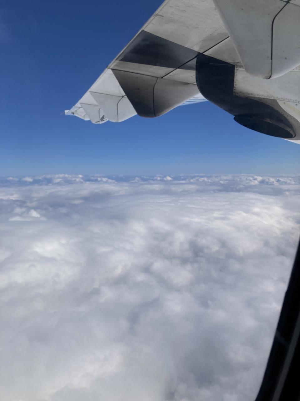 天候が不安定でしばらく揺れますとアナウンスがありましたが、雲の上は綺麗な青空 -