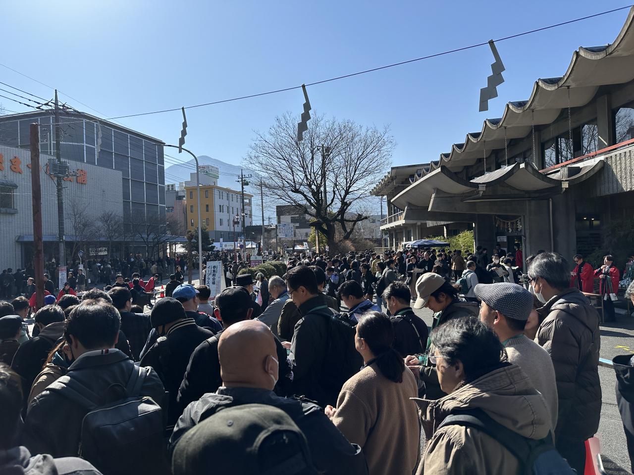 10:22 参集殿前は、入場を待つ列、グラス・ストラップを交換す人で溢れかえっています。秩父神社 寺・神社・教会