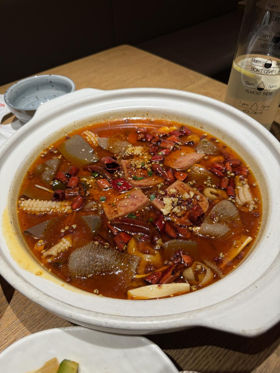 メインディッシュ。ホルモンの四川煮と思えばわかりやすいかもしれません。思いっきり好き嫌い分かれそうな一品 (笑