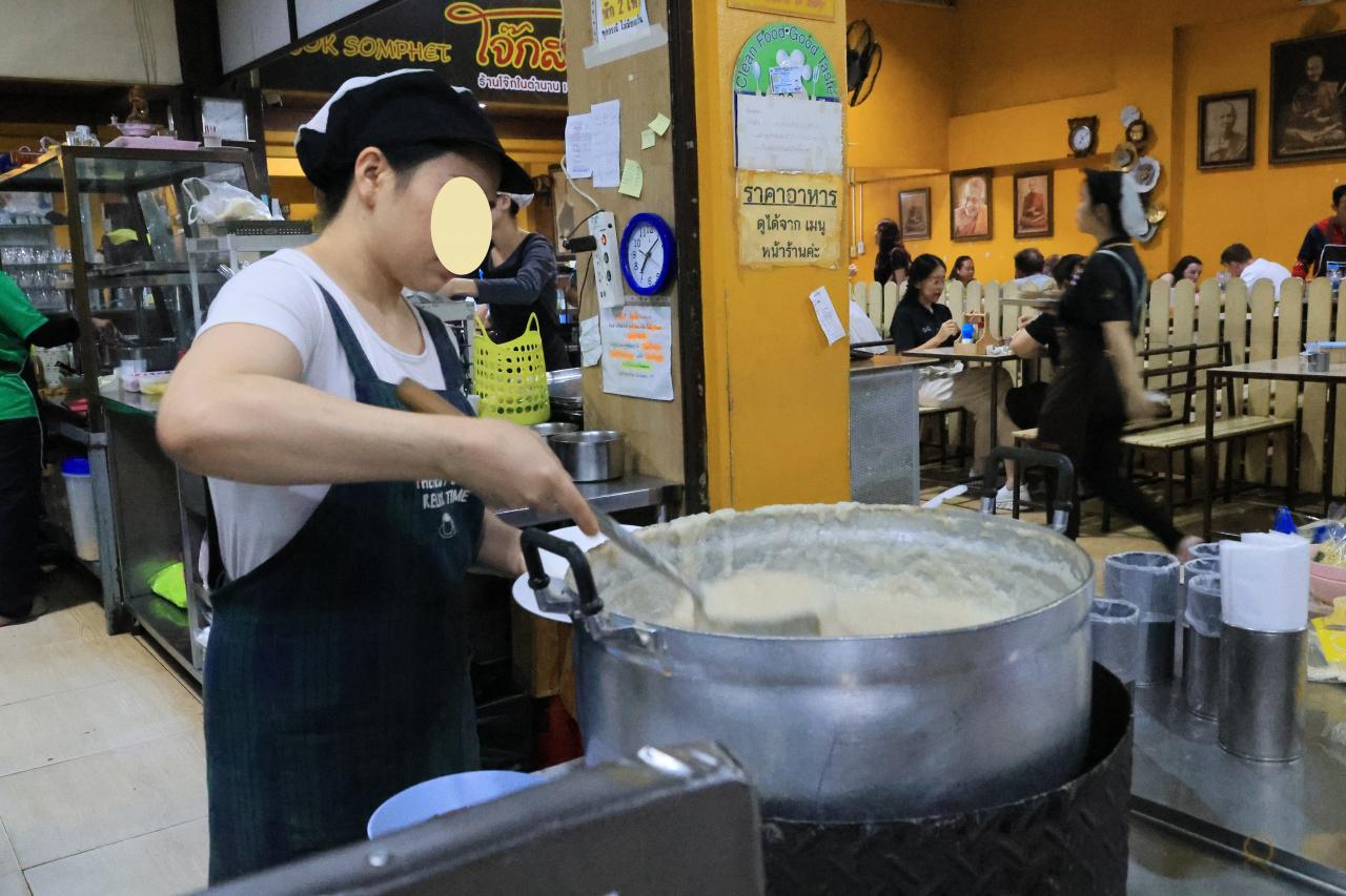 この大鍋で炊かれているお粥は大人気で、テイクアウトのお客さんがとても多かった。