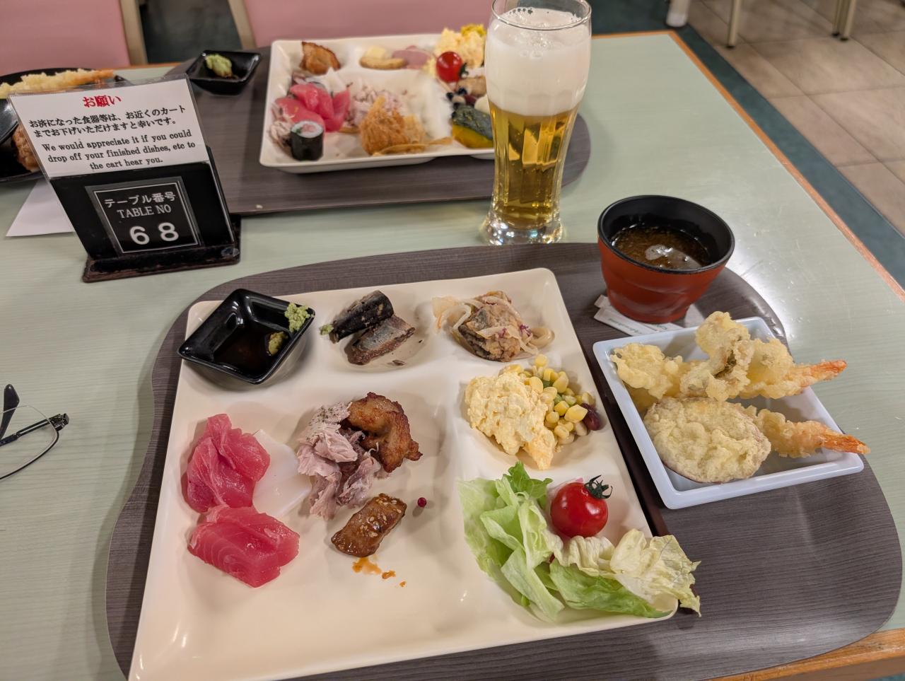 夕食はお楽しみ、飲み放題付きバイキングで、マグロ料理を中心にたくさんの料理がならんでいました。マグロの解体ショーもあったようですが、こちらは飲むのに忙しくてあまり食べることができませんでした。