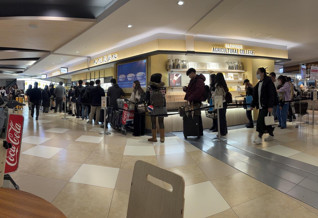 札幌農学校の焼きたてチーズケーキを買うために長蛇の列に並ぶ
