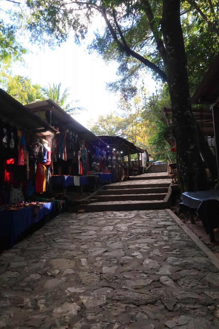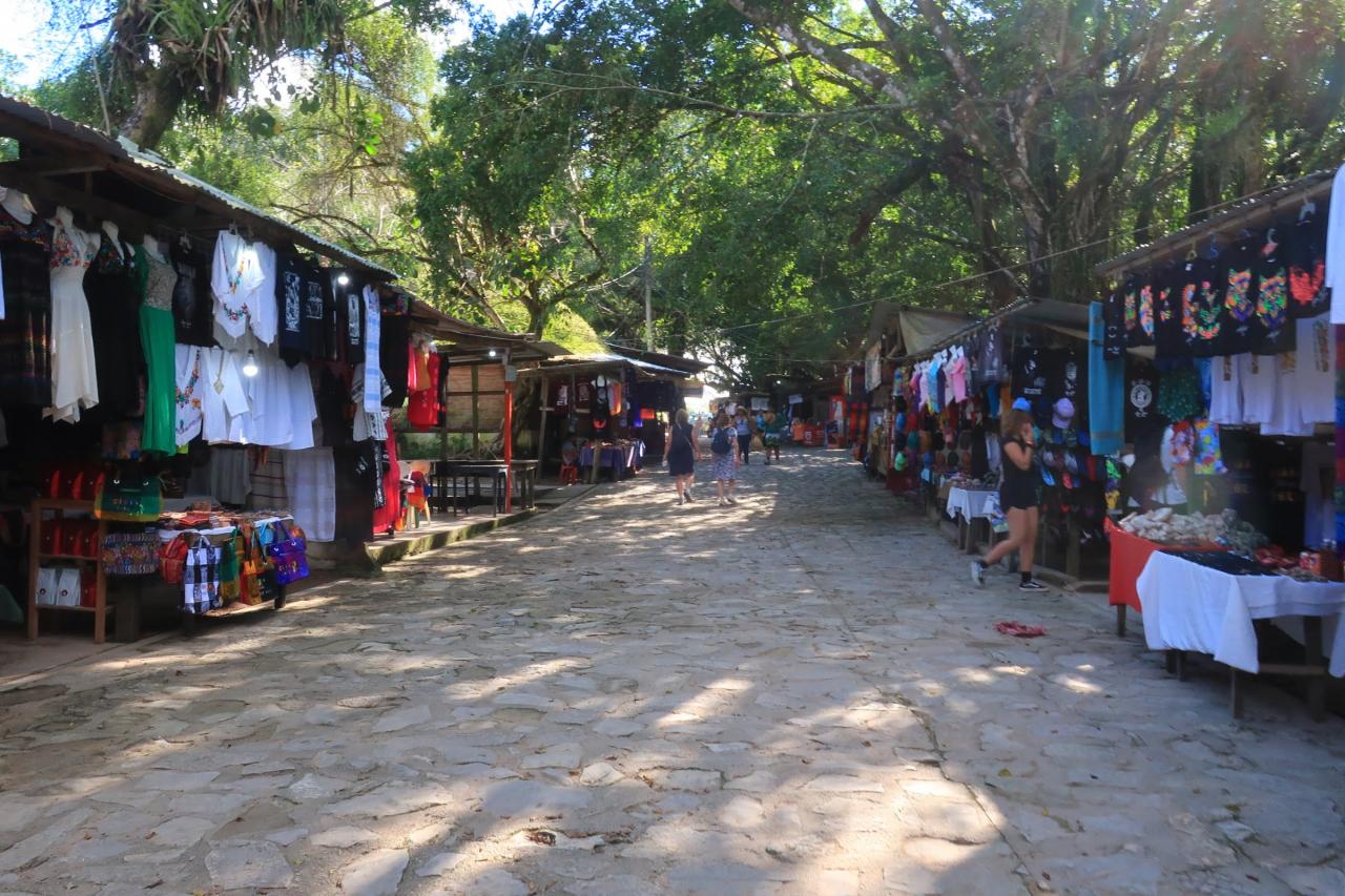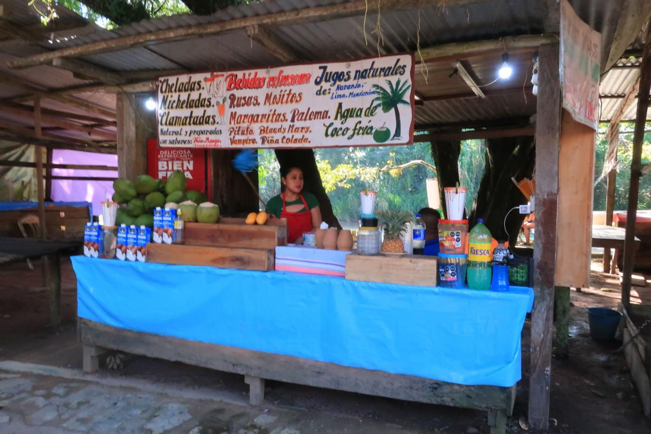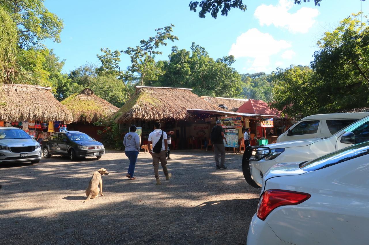 駐車場から道沿いにずらりとレストランや土産物店、ジューススタンド等が並んでいました。午前中にパレンケ遺跡でパンを食べたきりなので、お腹が空いていて何か食べたい。でも、滝の観光にどのくらい時間がかかるのか分からないのに、最初にレストランでがっつりと時間を使ってしまうのはリスクが高い…。なんか、サクッと食べられる軽食を売っていないかなぁ…?