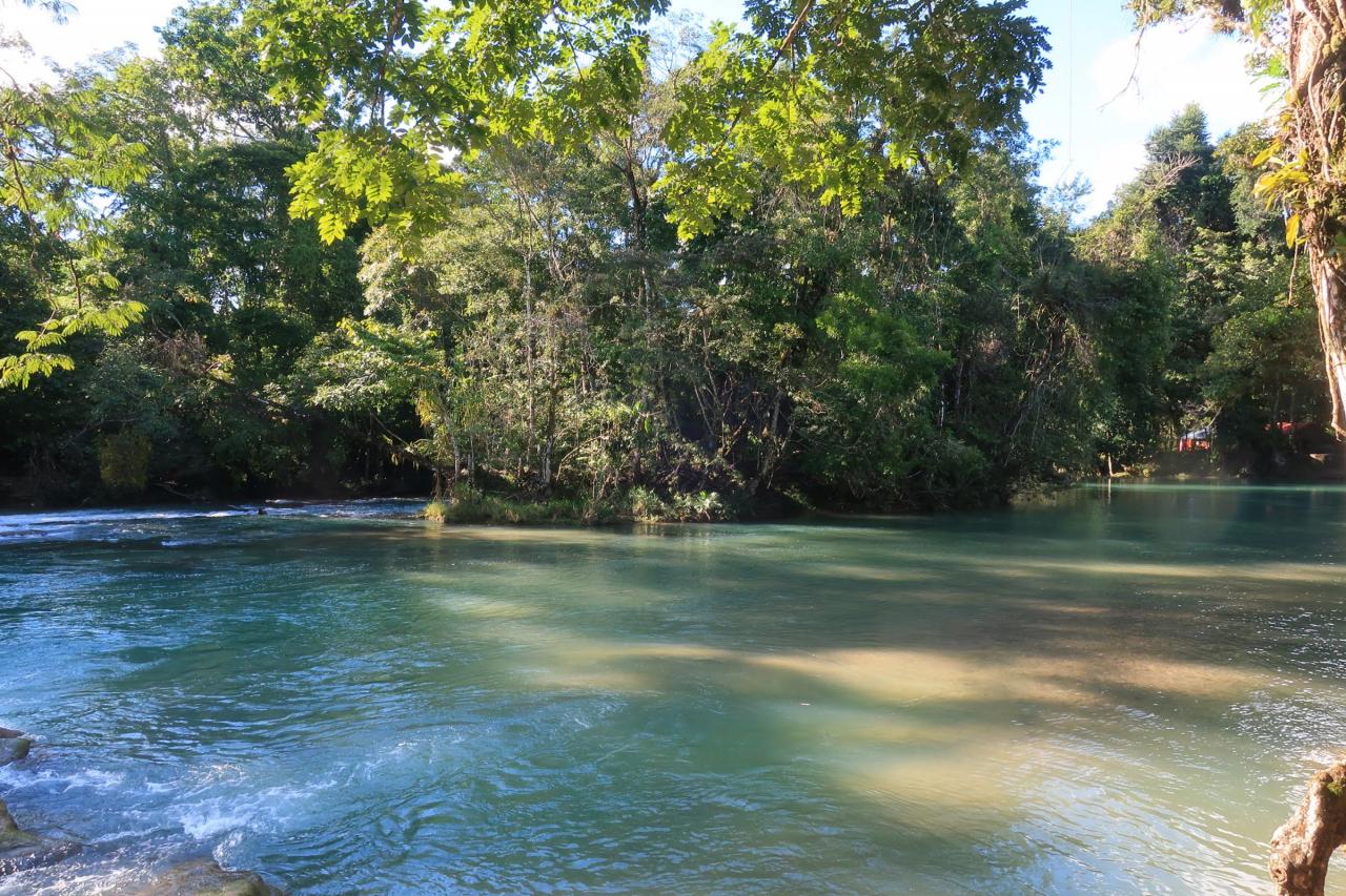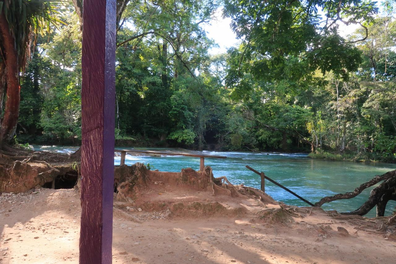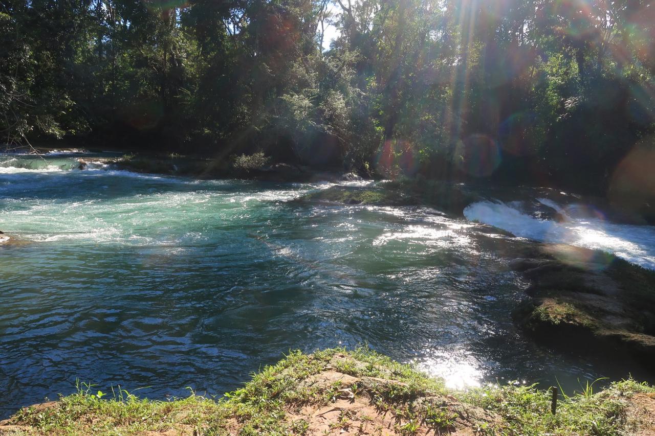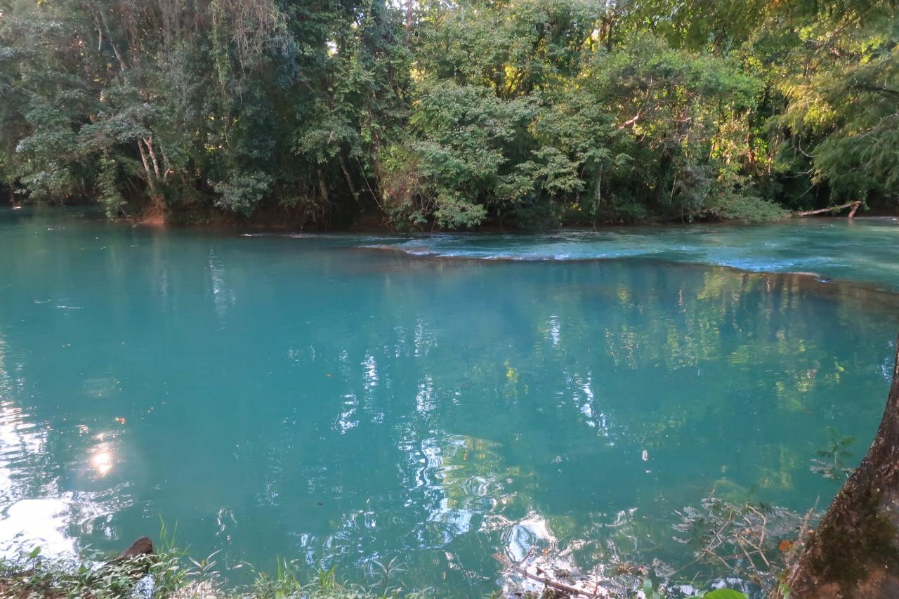 アグアアスールという名前はスペイン語で「青い水」という意味です。よく見かけるアグアアスールの写真は綺麗なターコイズブルー(少し乳白色が混ざったような青)だったのに、ここに来るまでに見た川の色はどちらかと言うと緑色でした。色が違うじゃ~んと思っていたけど、ここから見ると確かにターコイズブルーに見えます。 -