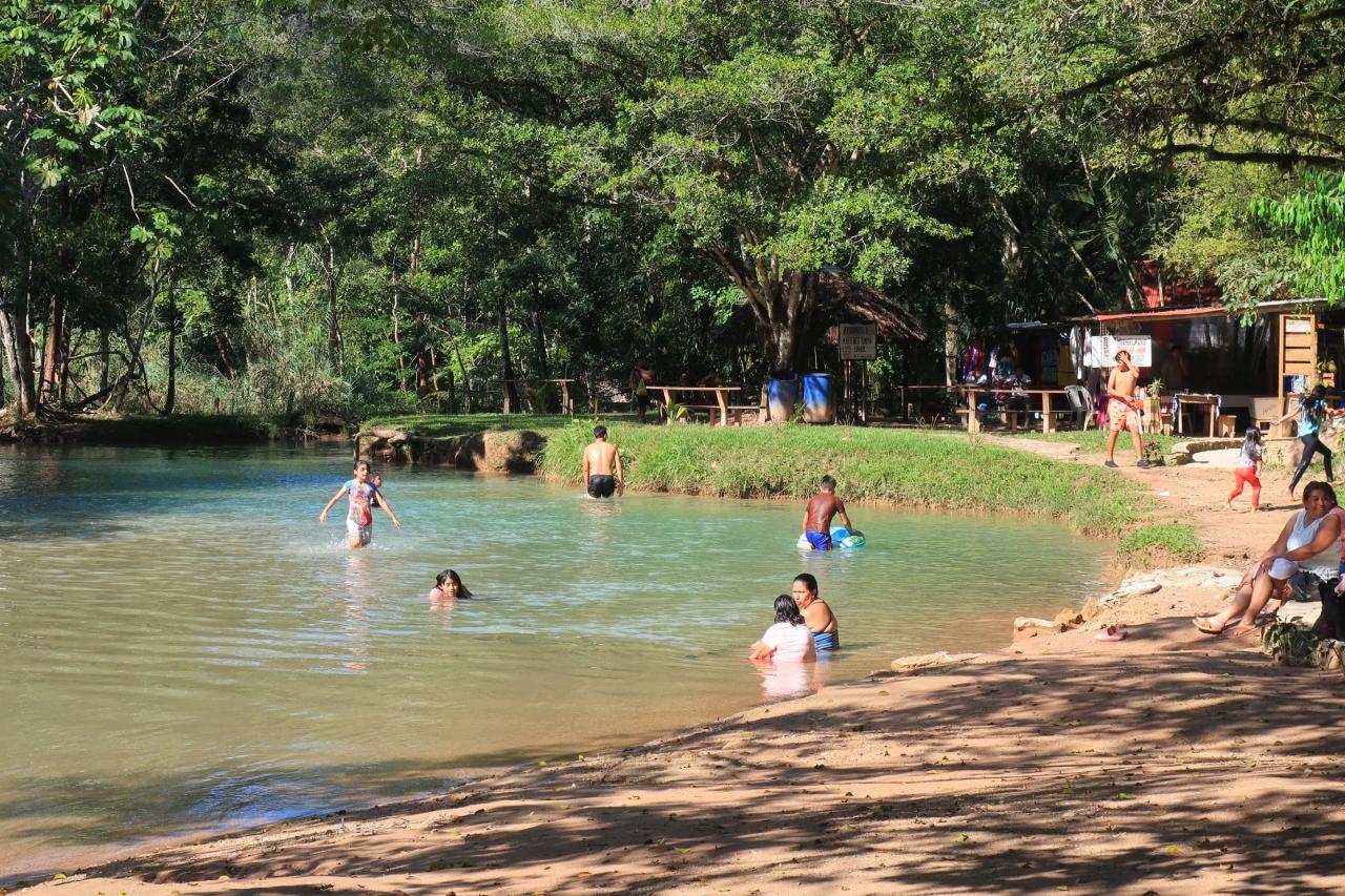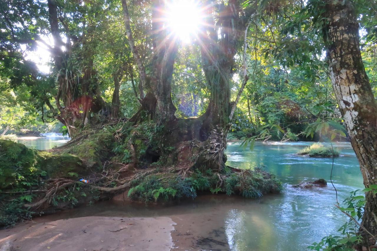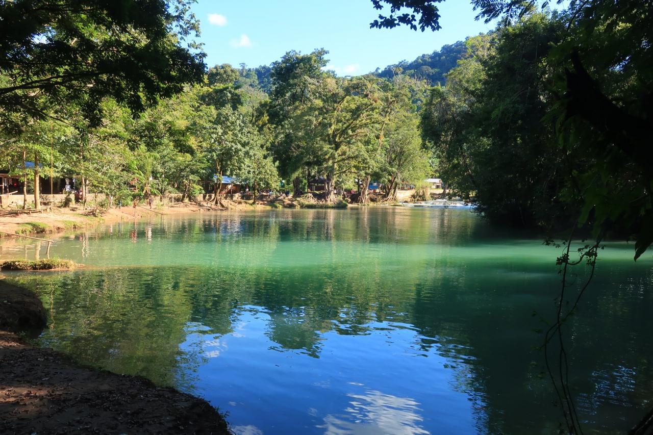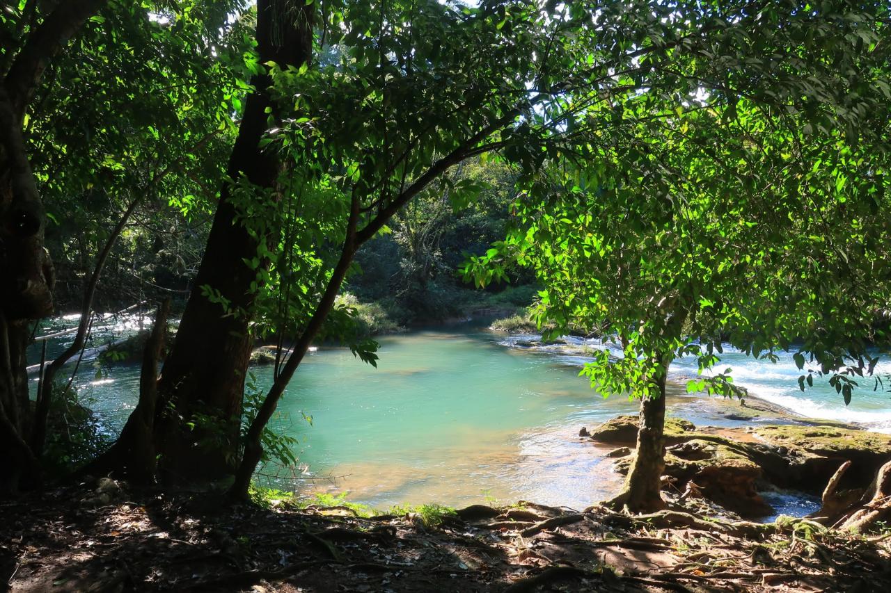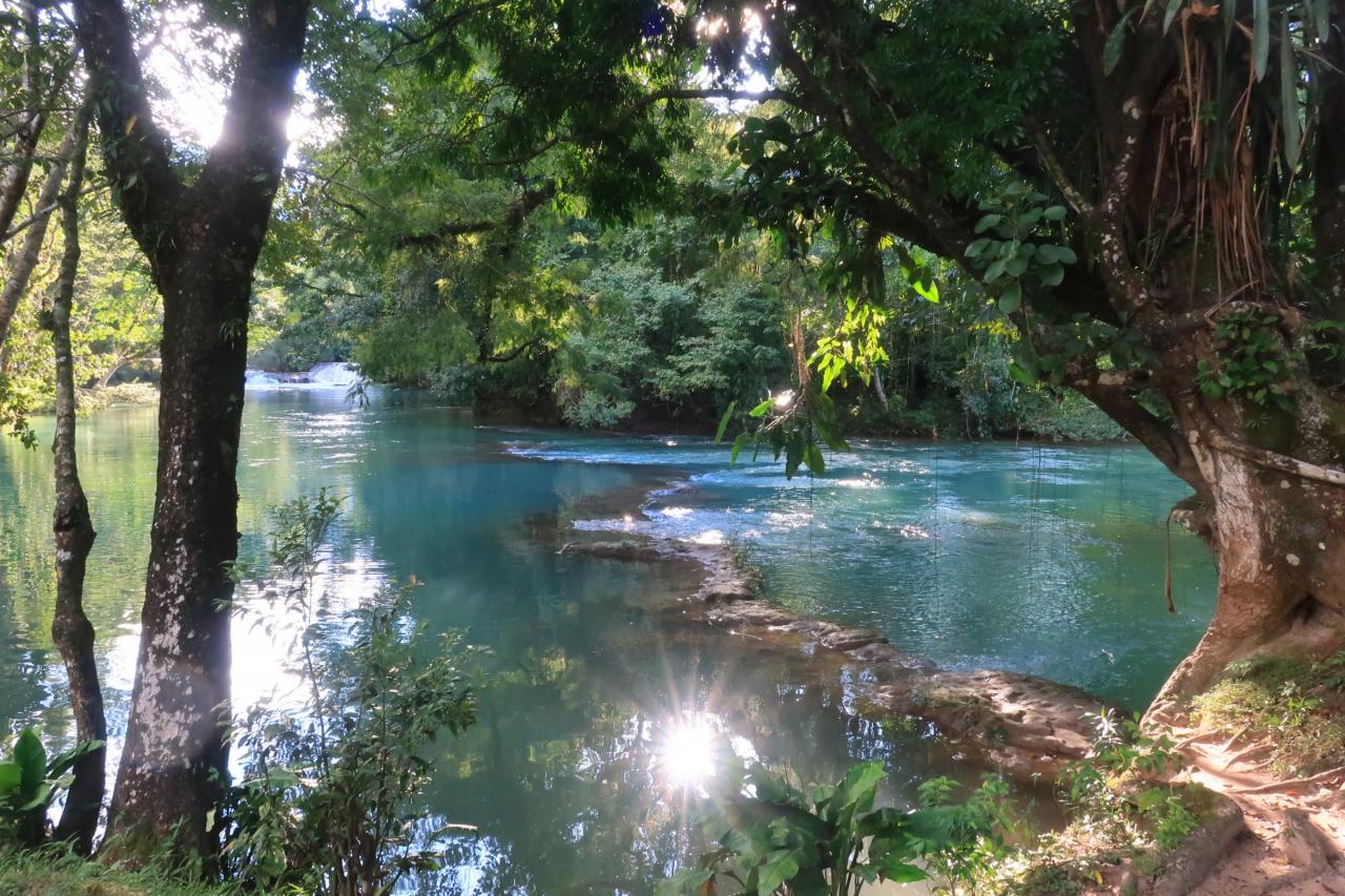 アグアアスールという名前はスペイン語で「青い水」という意味です。よく見かけるアグアアスールの写真は綺麗なターコイズブルー(少し乳白色が混ざったような青)だったのに、ここに来るまでに見た川の色はどちらかと言うと緑色でした。色が違うじゃ~んと思っていたけど、ここから見ると確かにターコイズブルーに見えます。 -