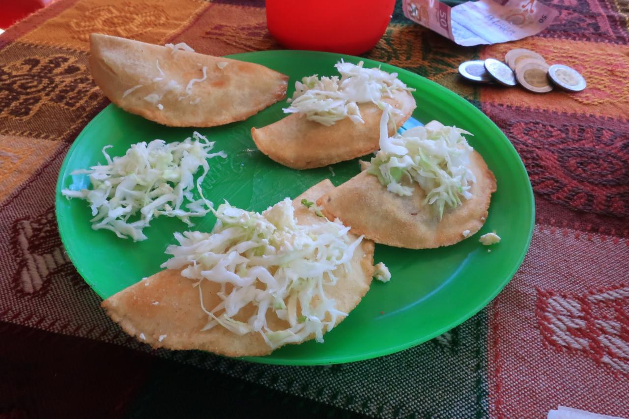 この先はもうお店がなさそう…というギリギリ最後のお店を見つけて、二人でエンパナーダを食べることになりました。4個入りのエンパナーダが50MXN、それぞれペットボトルのお水を頼んで、全部で100MXN(900円)でした。ジョーがおごってくれると言ってくれたけど、さすがに悪いので割り勘にしようと言いました。(というか、本当私がおごらなきゃですよね?) エンパナーダは具材を選べて、チーズと豆を2個ずつ頼みました。このお店はお客さんが少ないせいか、私がもっと賑やかなエリアで見たお店のように、使い古した油がお鍋に入れられているということはなく、私たちのオーダーが入って初めて油を入れていました。新しい油での揚げたてなので、全然油っぽくなく、ばくばく食べることができました。揚げ餃子みたいでおいしい! 私の食べっぷりに呆れたのか、エンパナーダを1個食べただけのジョーが、「僕はスナックを食べたばかりだから、1個でおなかいっぱいになっちゃた。残りの1個を食べてくれない?」と言ってくれました。ジョー、本当にいい人~(2回目) 譲り方が紳士です。そして、遠慮なくいただく(←図々しい)