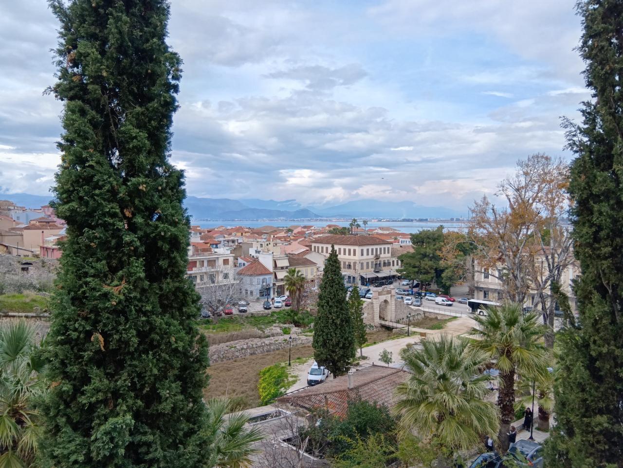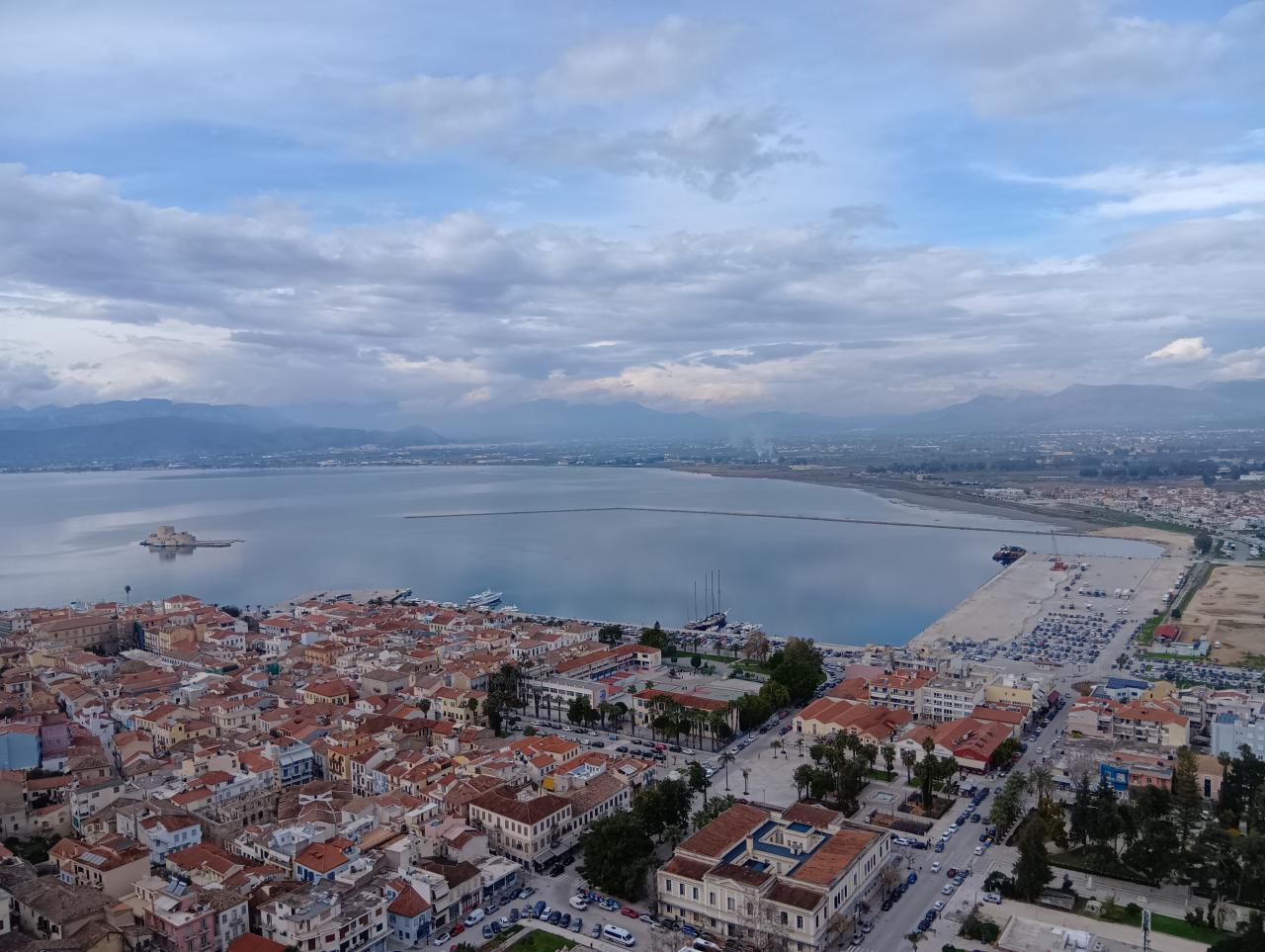 城塞も含めて旧市街やアクロナウプリア城を映します。