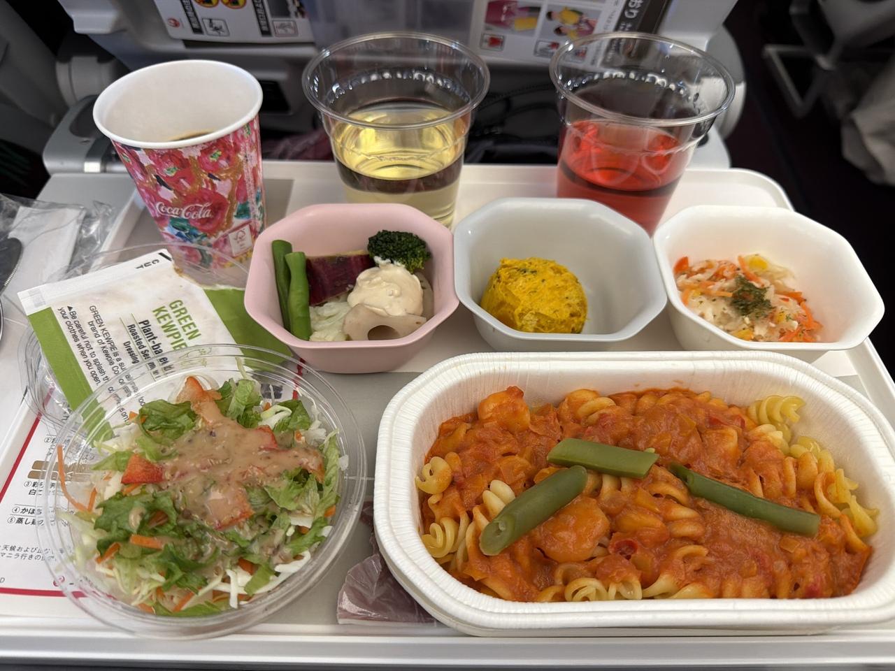 楽しみな機内食。パスタにしたけど激薄・・下記のメニューでした。